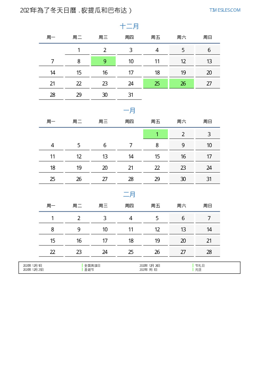 安提瓜和巴布达下載並打印2021年為了冬天假期和周末的PDF日曆