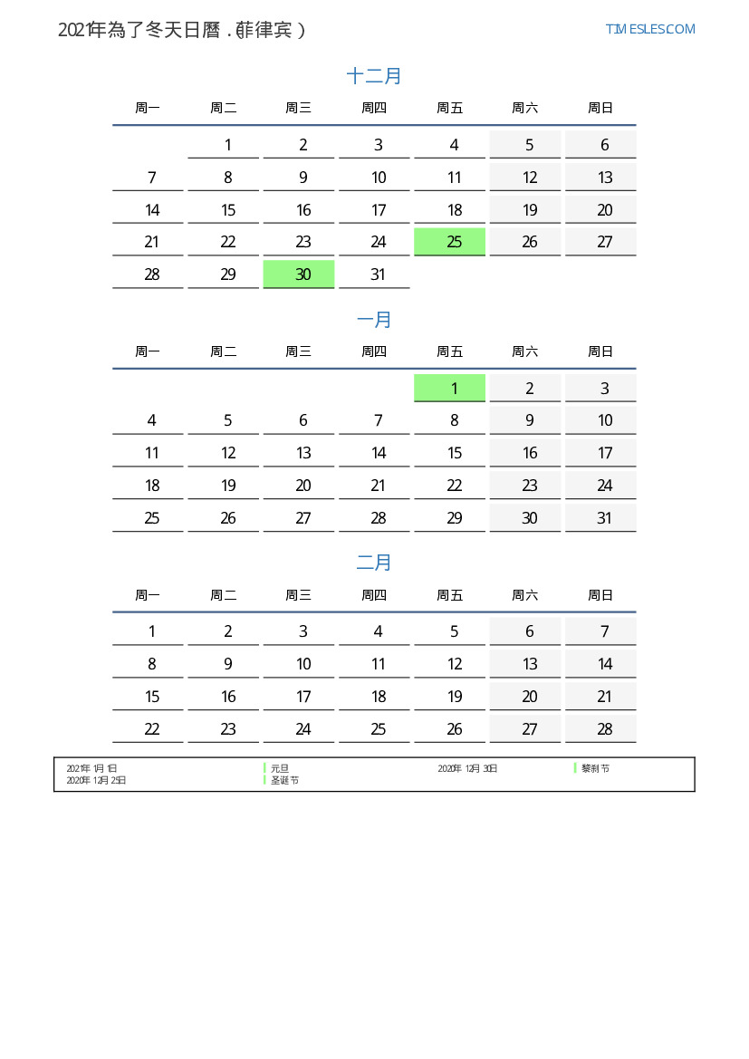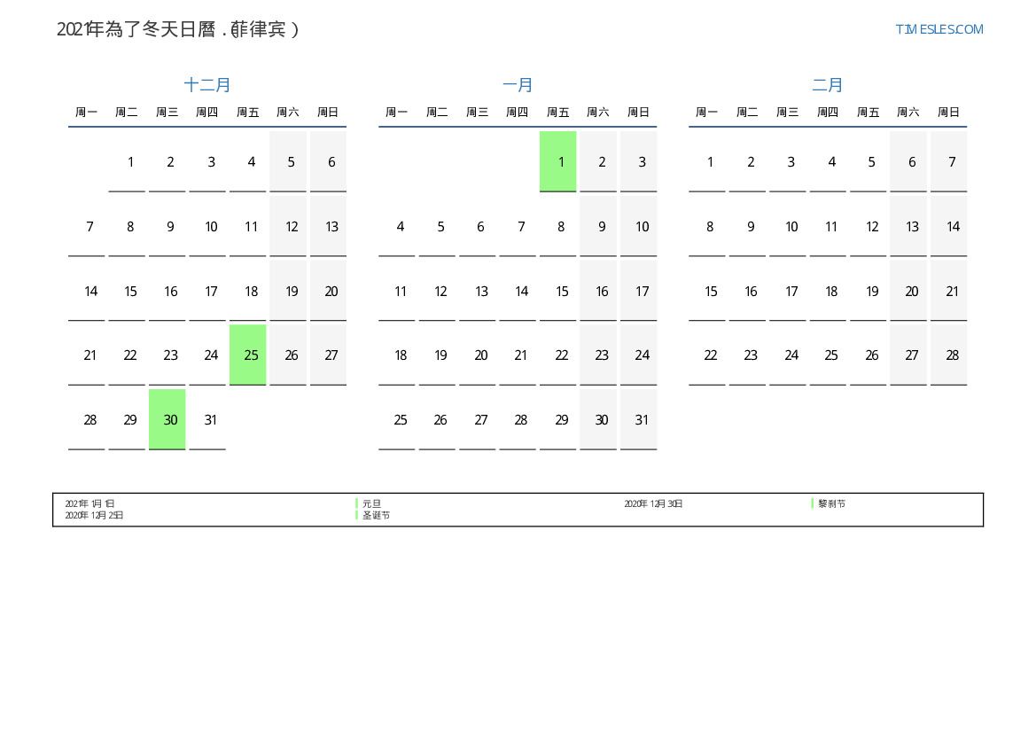 菲律宾下載並打印2021年為了冬天假期和周末的PDF日曆