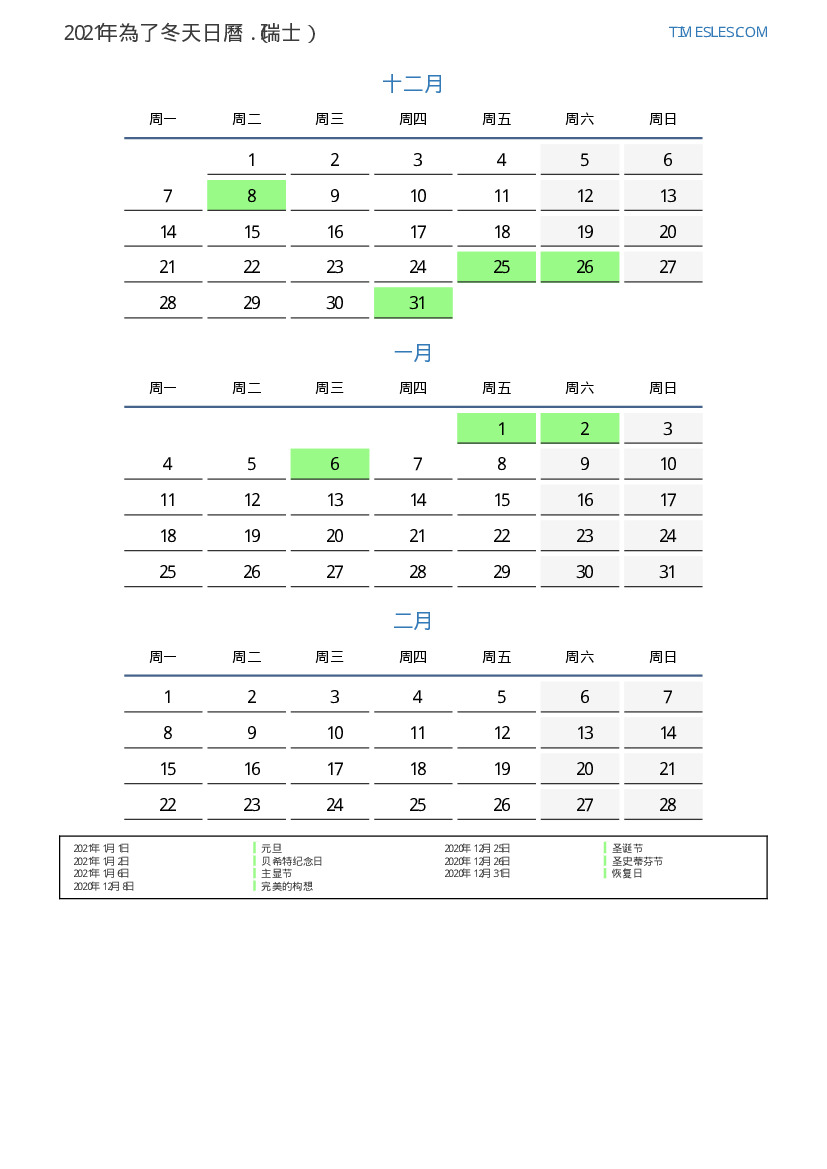 瑞士下載並打印2021年為了冬天假期和周末的PDF日曆