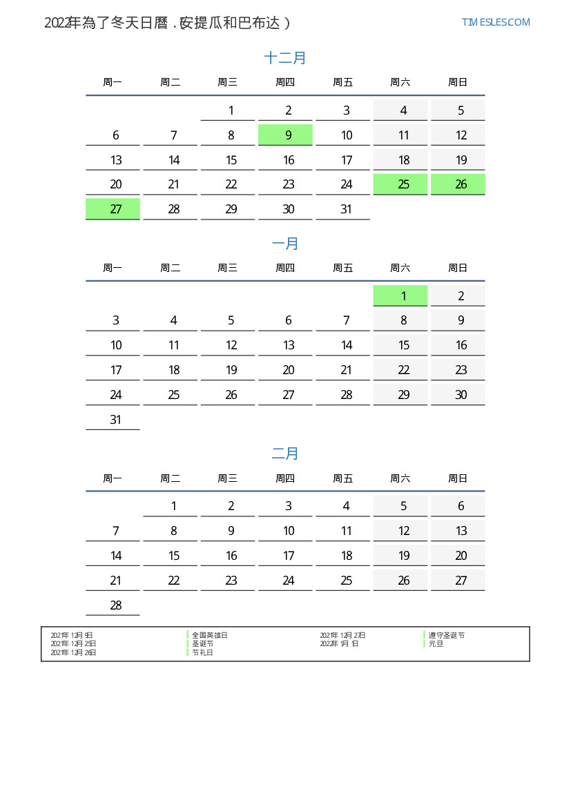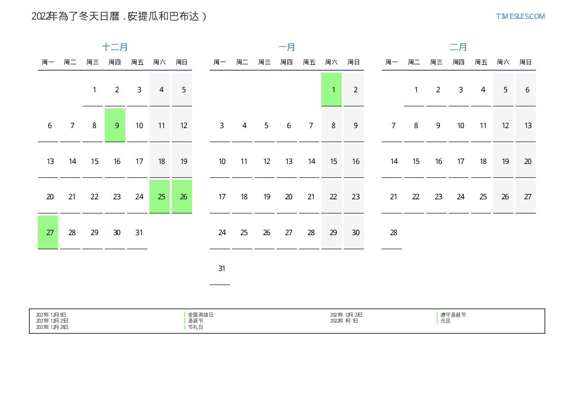 安提瓜和巴布达2022年為了冬天假期和周末的日曆