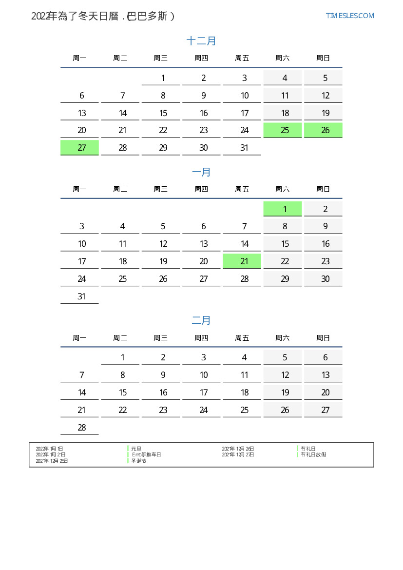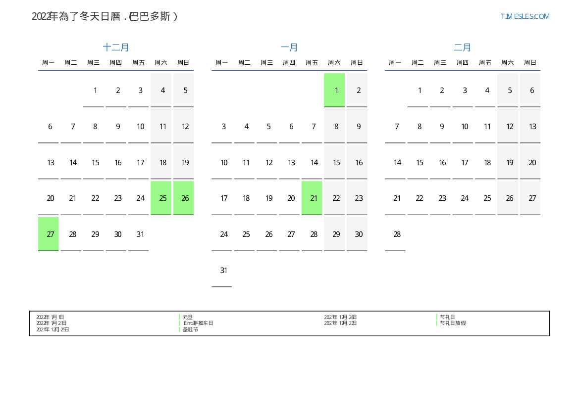 巴巴多斯2022年為了冬天假期和周末的日曆