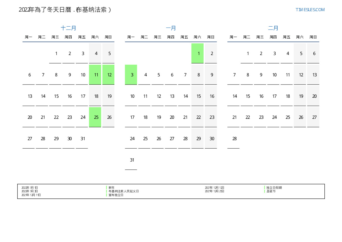 布基纳法索2022年為了冬天假期和周末的日曆