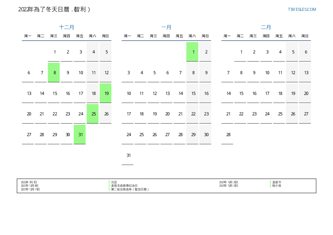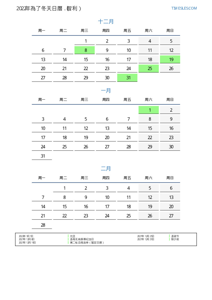 智利2022年為了冬天假期和周末的日曆
