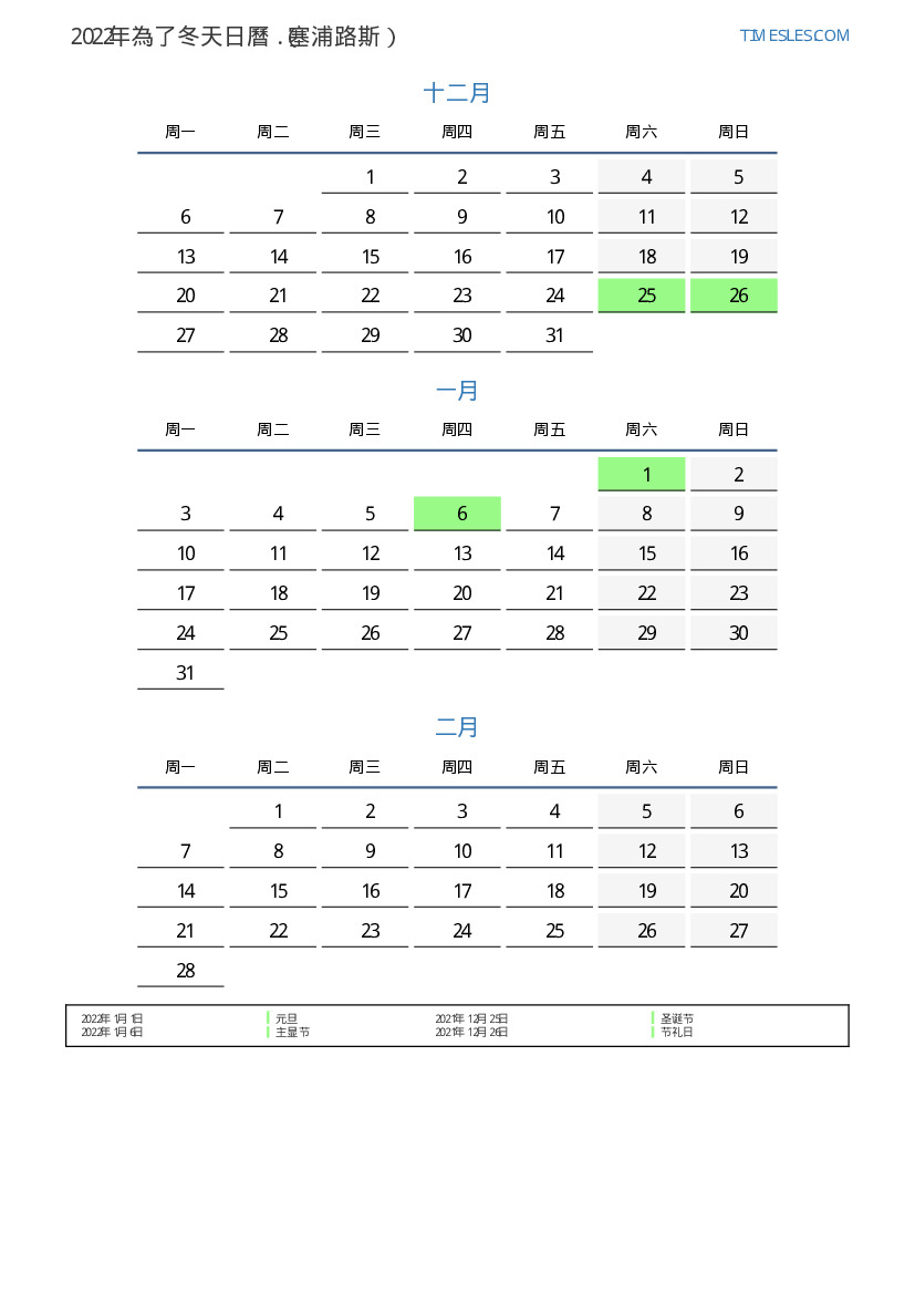 塞浦路斯下載並打印2022年為了冬天假期和周末的PDF日曆
