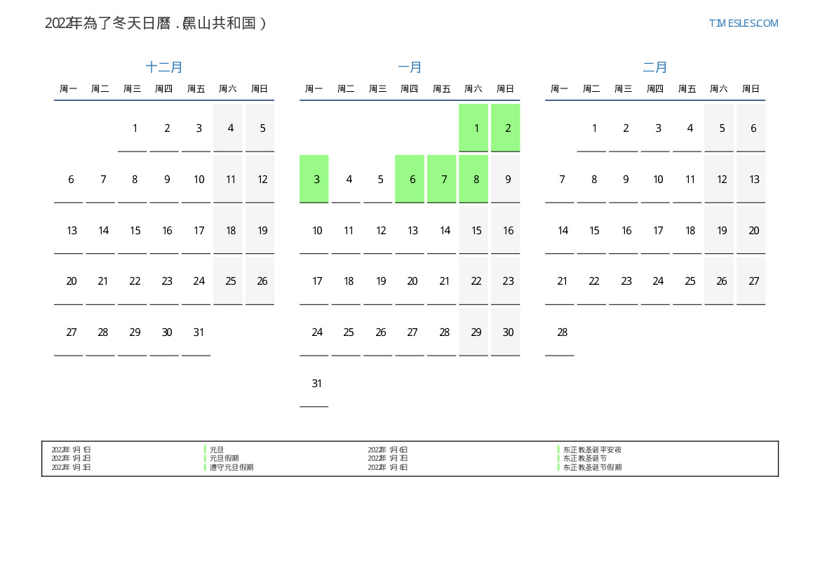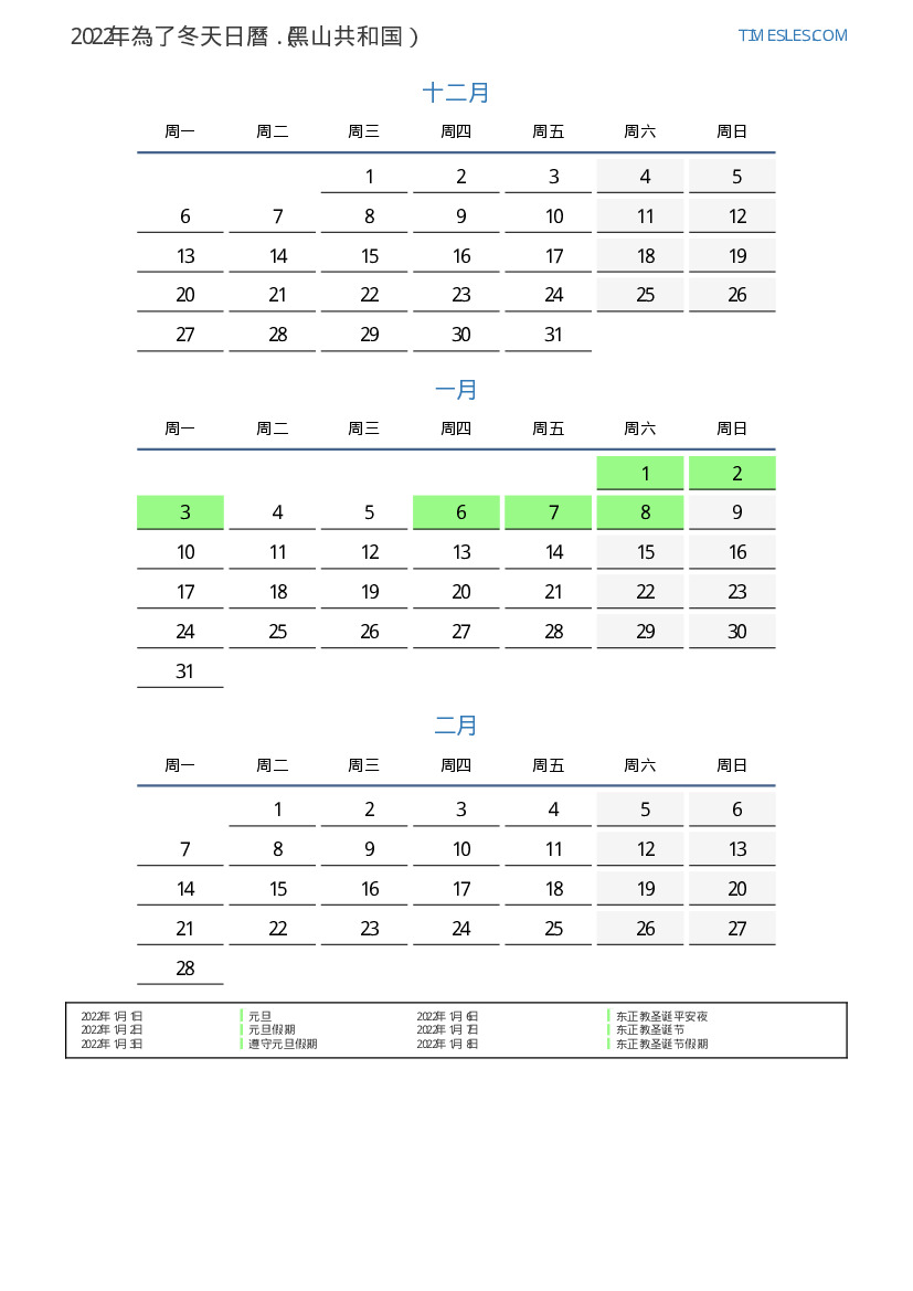 黑山共和国下載並打印2022年為了冬天假期和周末的PDF日曆