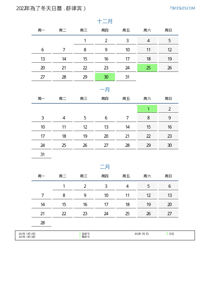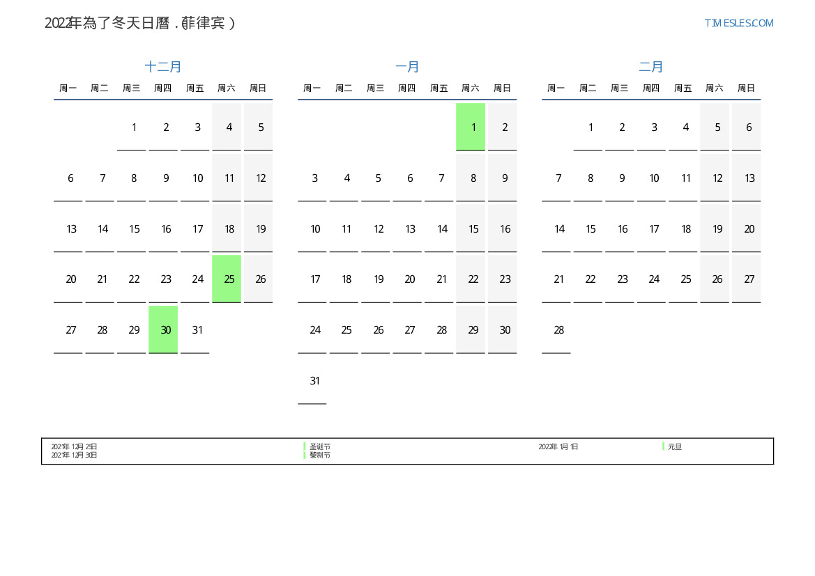 菲律宾下載並打印2022年為了冬天假期和周末的PDF日曆