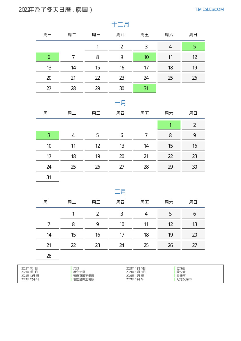 为泰国下載並打印2022年為了冬天假期和周末的PDF日曆
