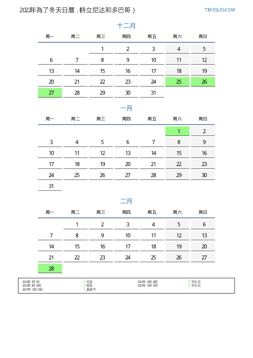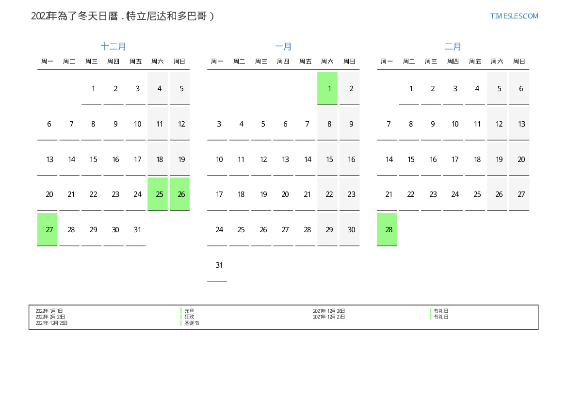 特立尼达和多巴哥下載並打印2022年為了冬天假期和周末的PDF日曆