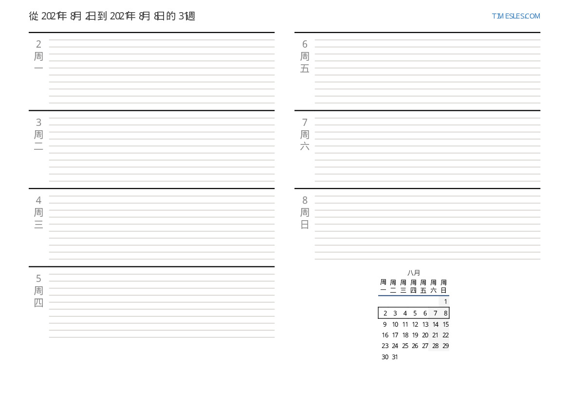 從2021年8月2日至2021年8月8日每週下載並打印2021年第31週的PDF日曆