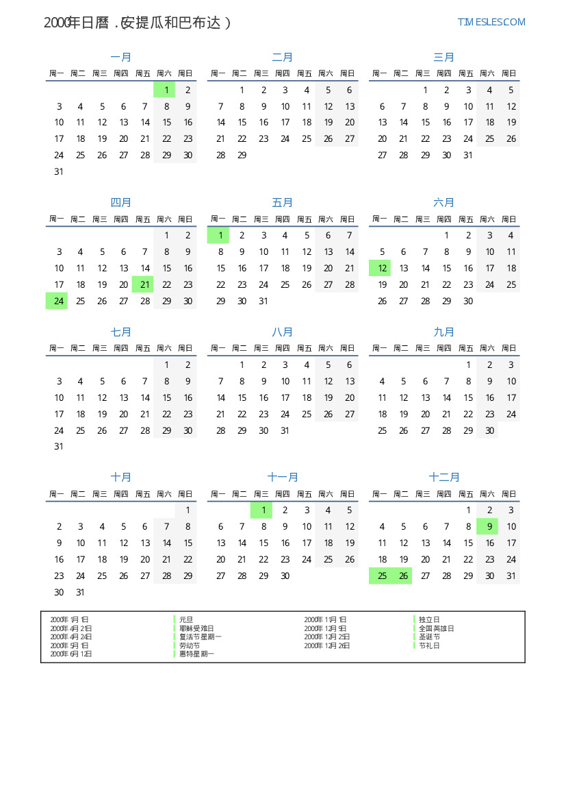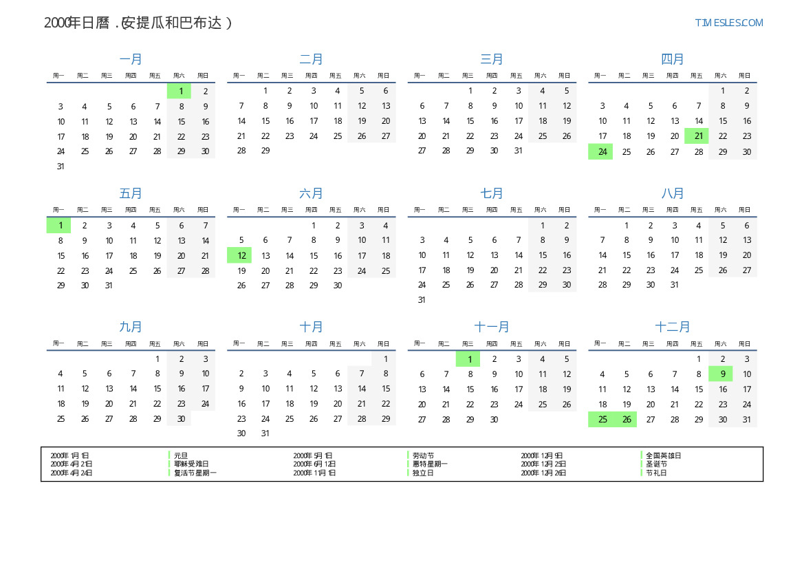 2000年安提瓜和巴布达日曆