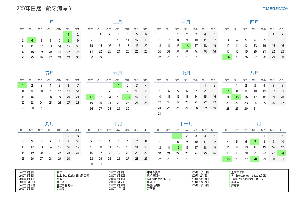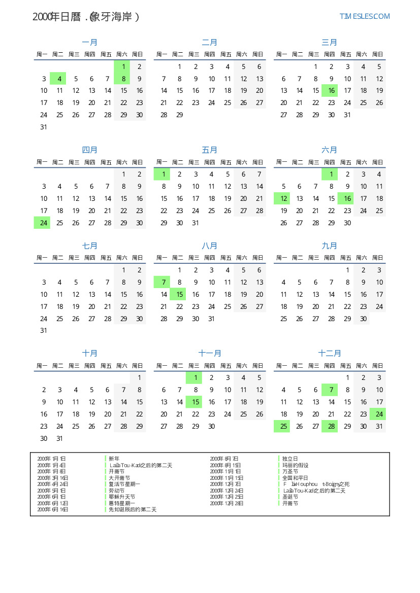 下載並打印2000年科特迪瓦節假日和周末的PDF日曆