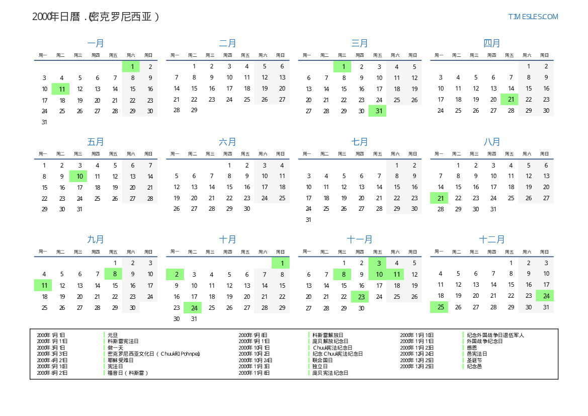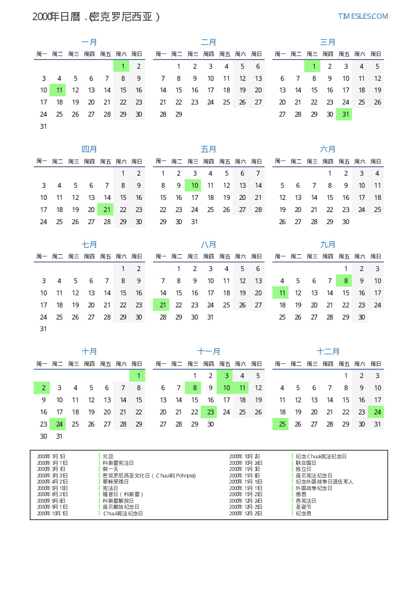 下載並打印2000年密克罗尼西亚節假日和周末的PDF日曆