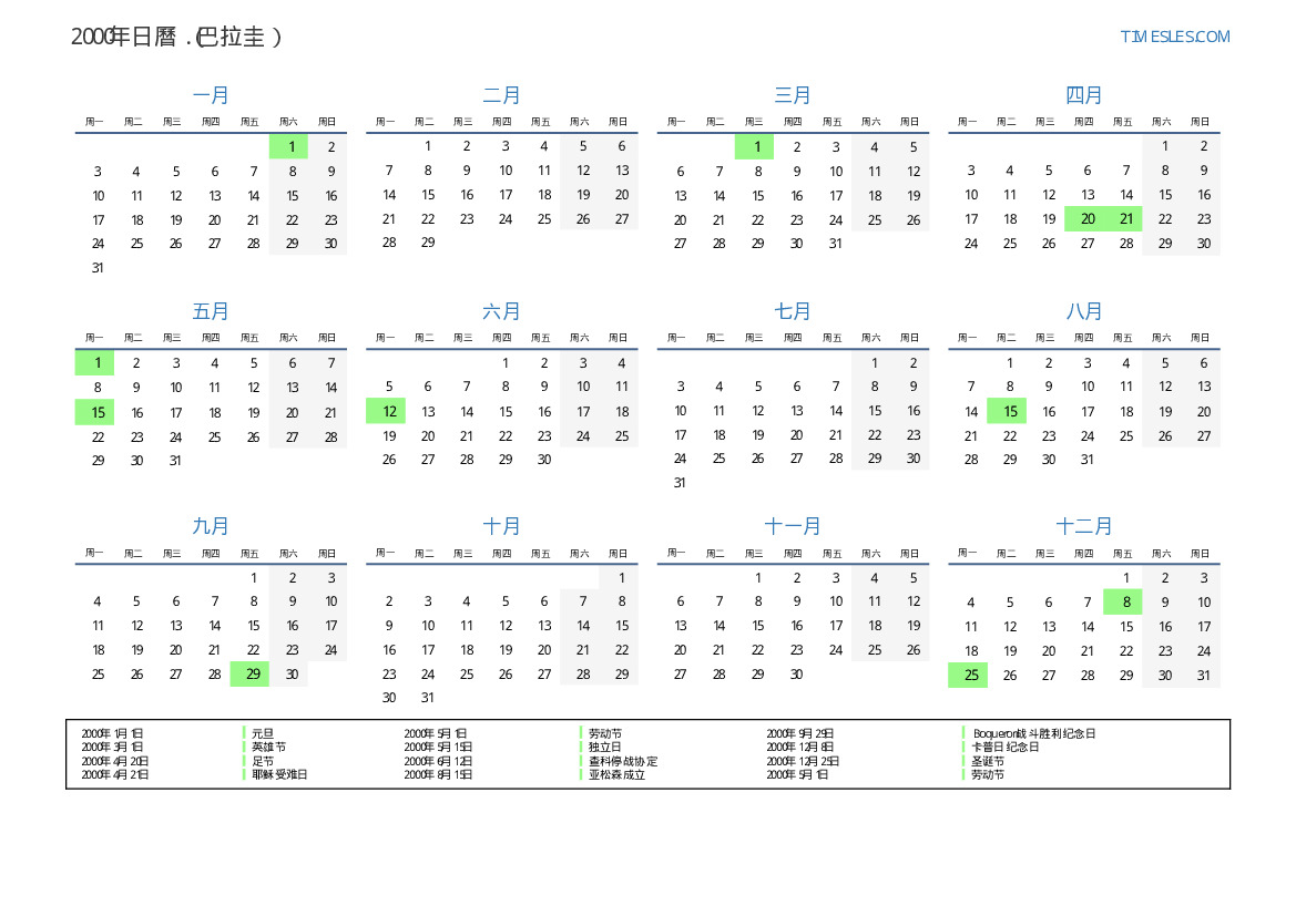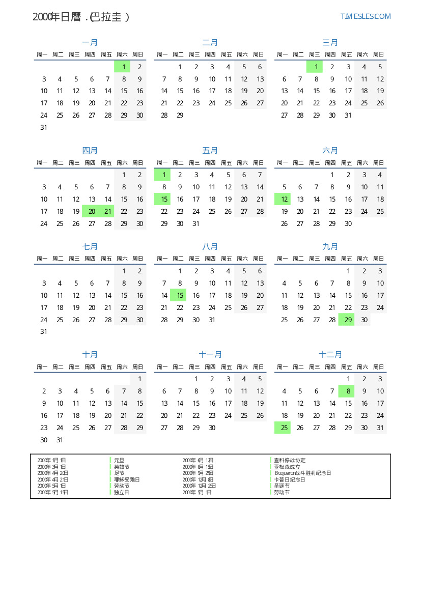 下載並打印2000年巴拉圭節假日和周末的PDF日曆