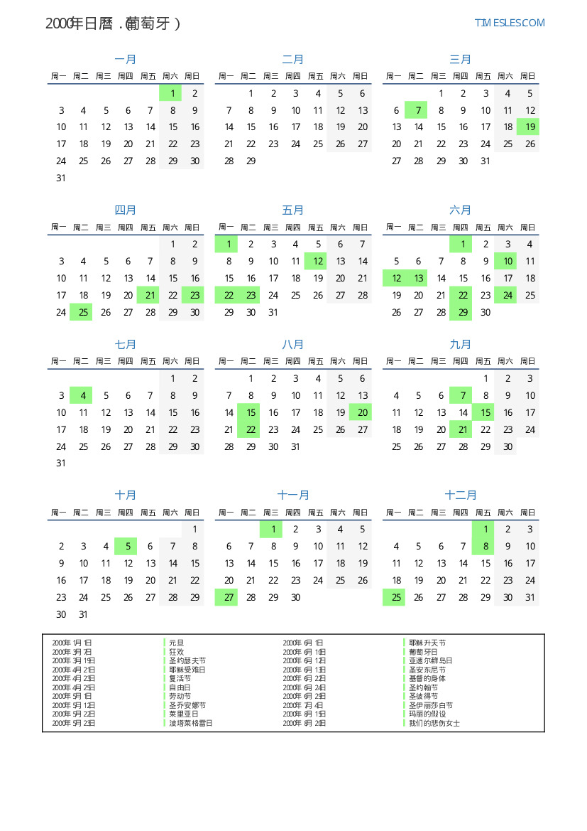 下載並打印2000年葡萄牙節假日和周末的PDF日曆
