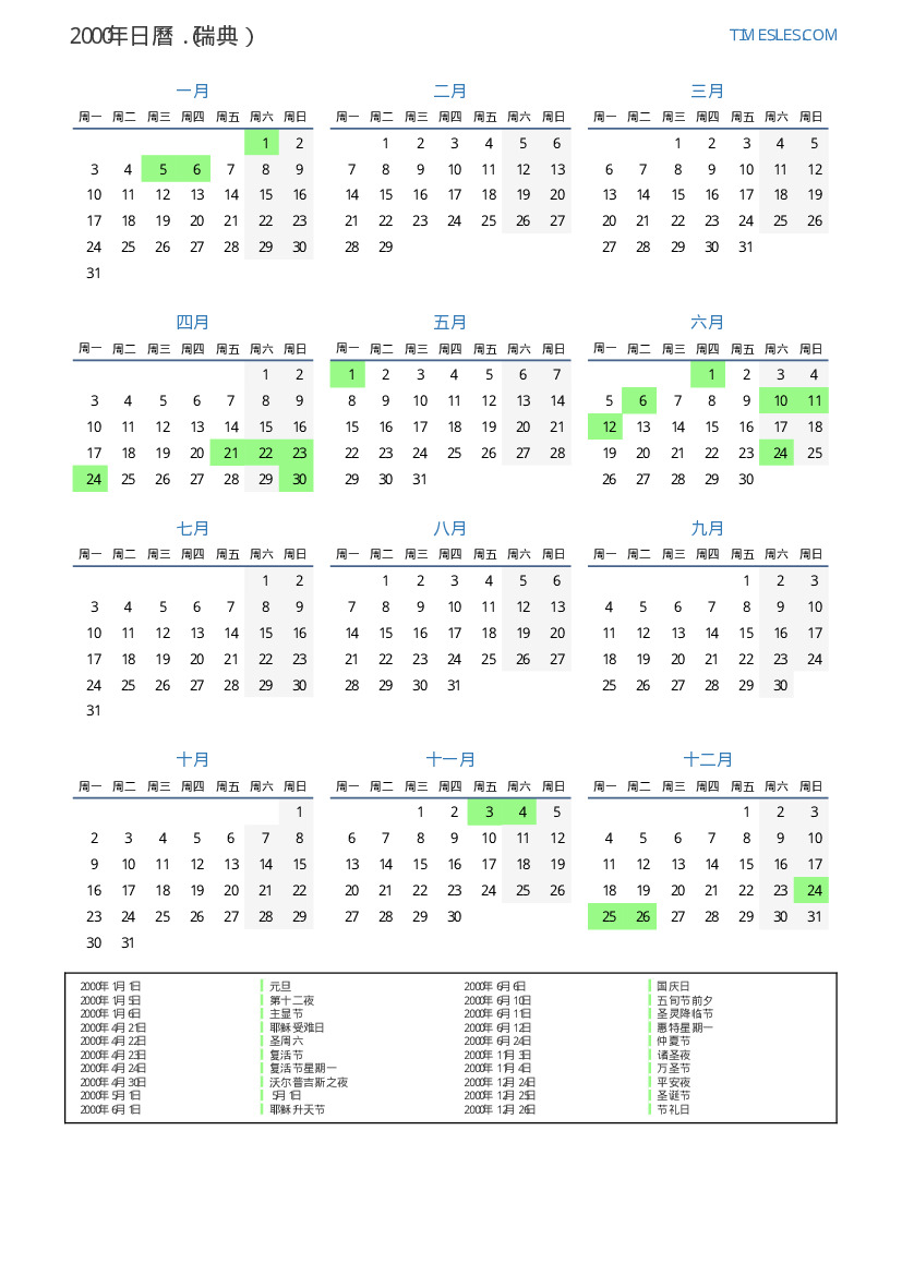 下載並打印2000年瑞典節假日和周末的PDF日曆