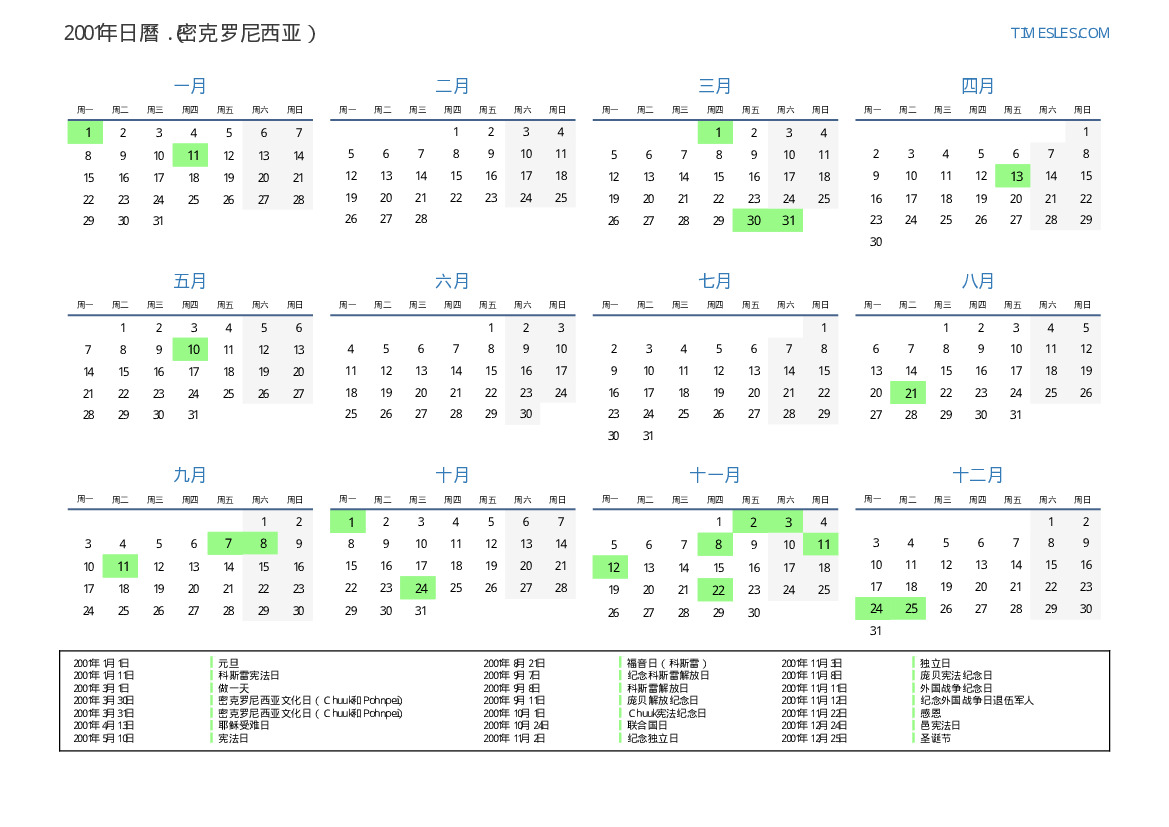 下載並打印2001年密克罗尼西亚節假日和周末的PDF日曆