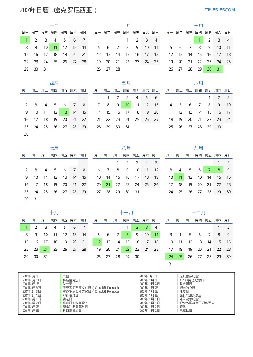 盧薩密克罗尼西亚的2001年假期和周末日曆