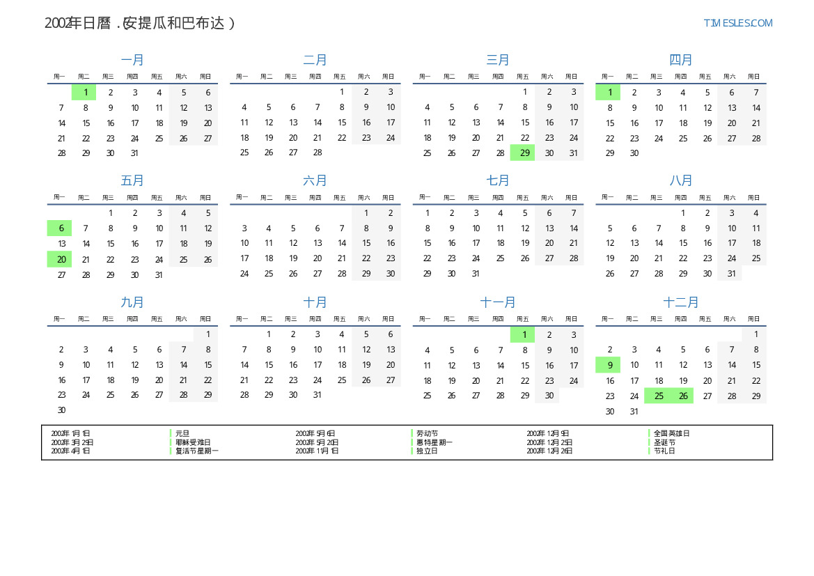 下載並打印2002年安提瓜和巴布达節假日和周末的PDF日曆