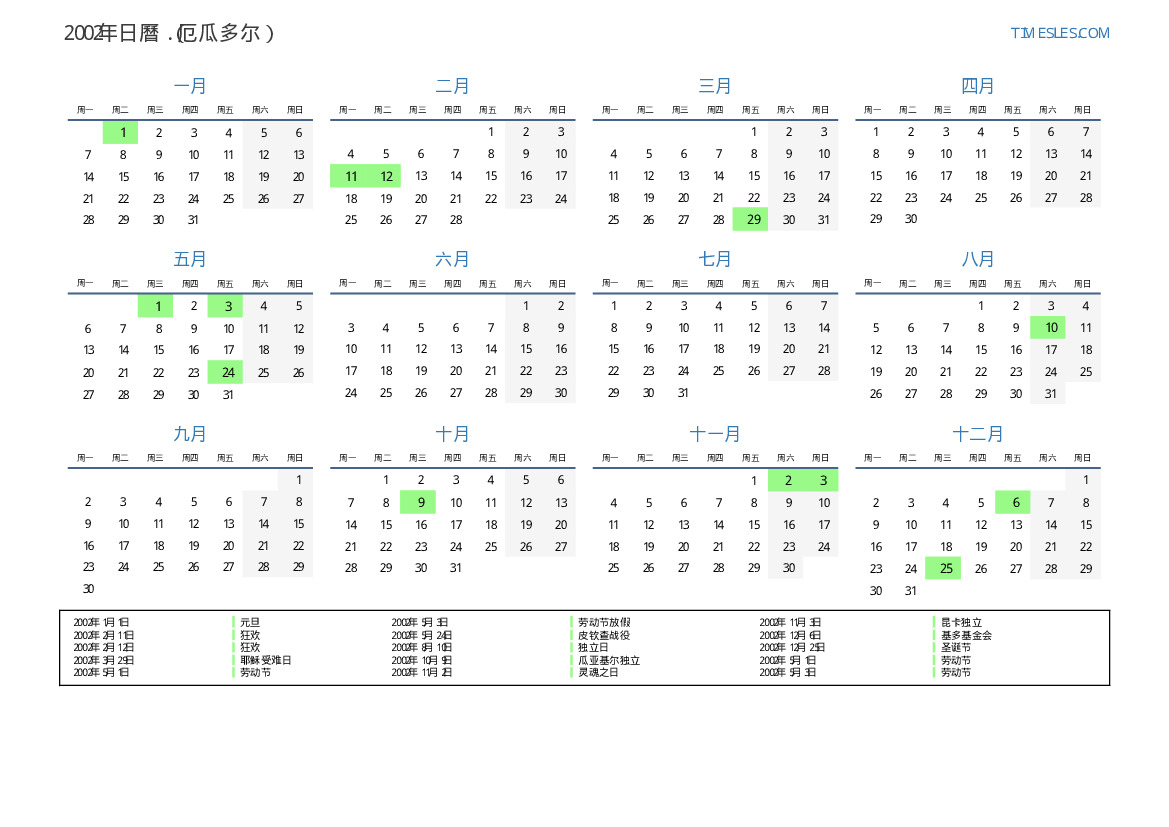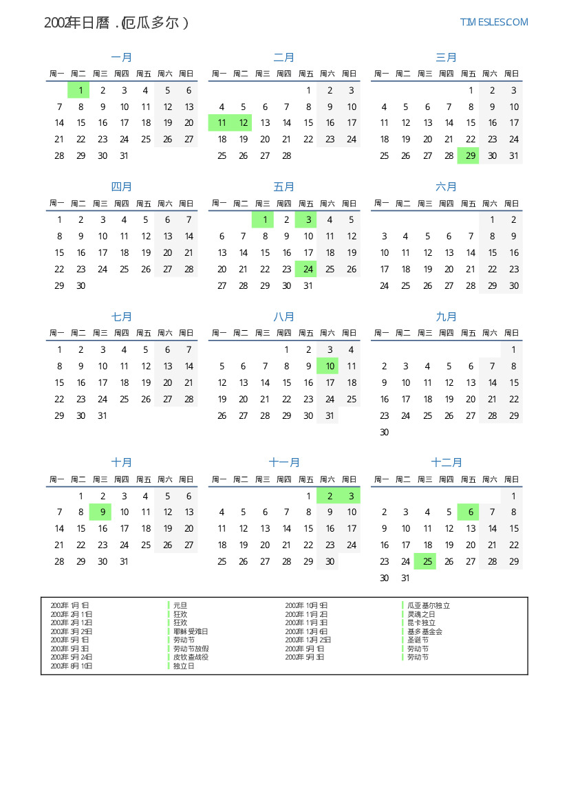 2002年厄瓜多尔日曆