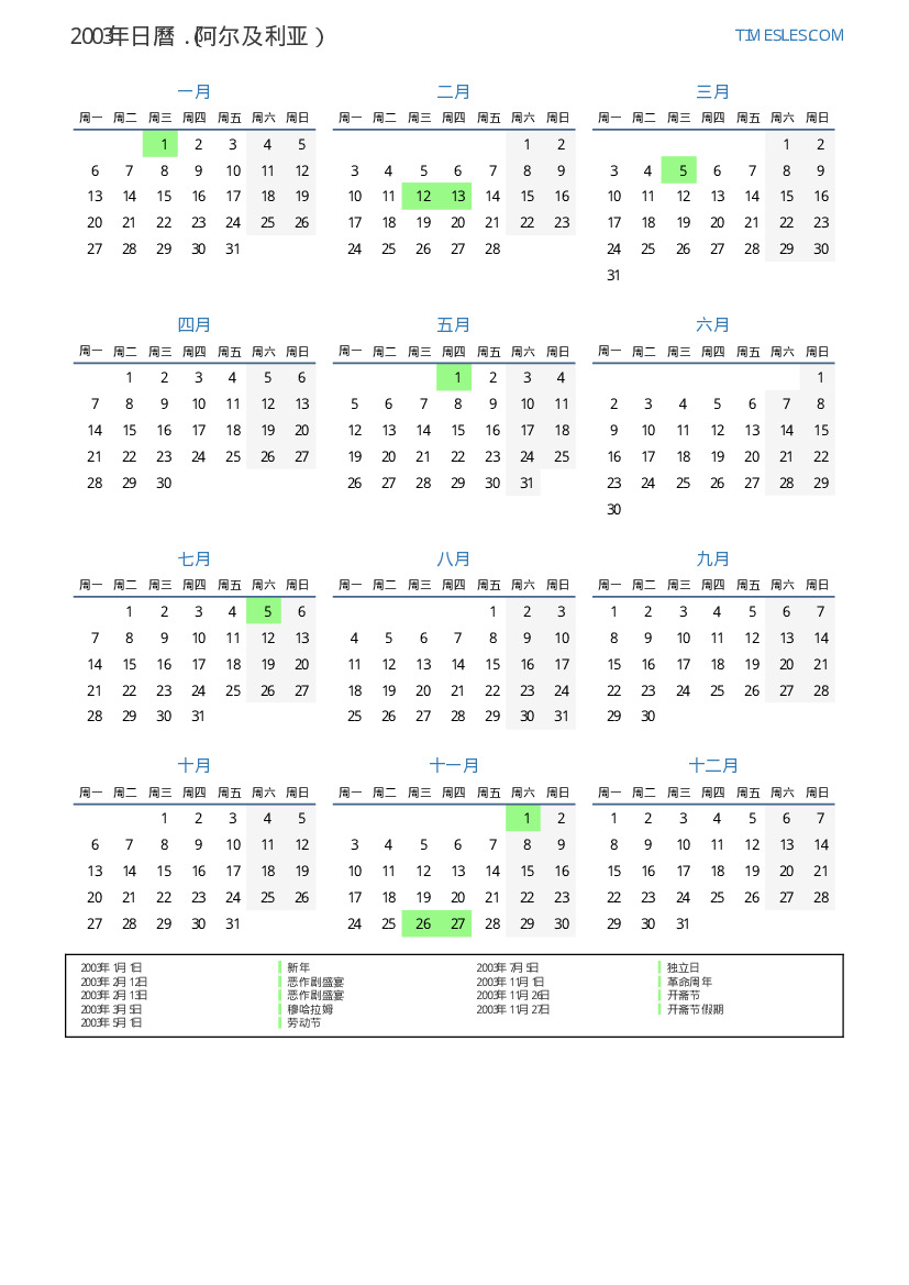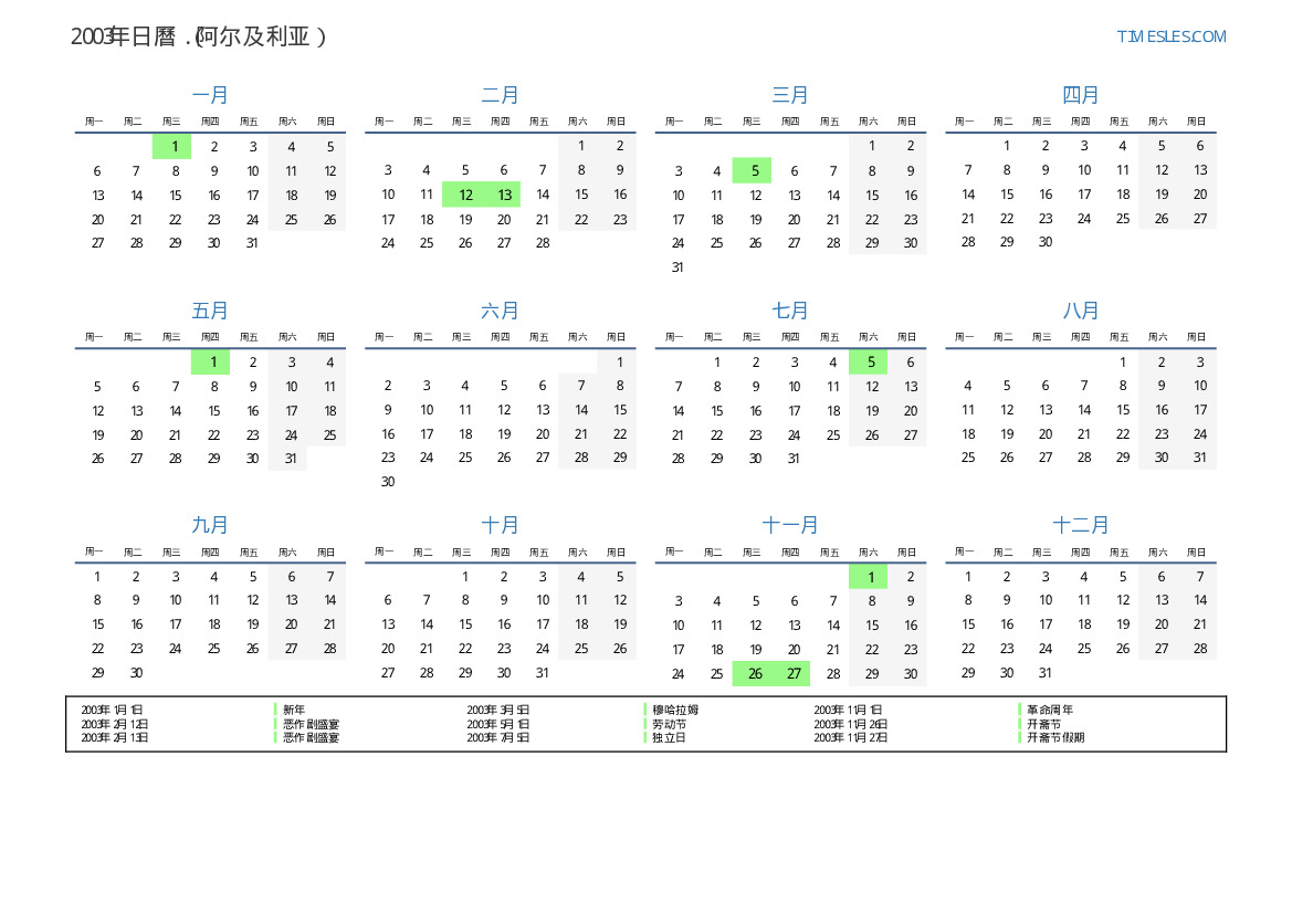 下載並打印2003年阿尔及利亚節假日和周末的PDF日曆