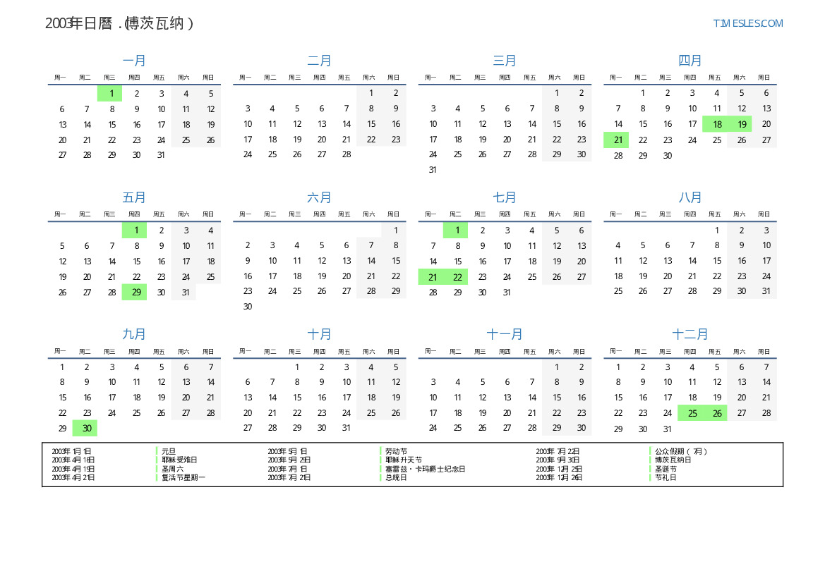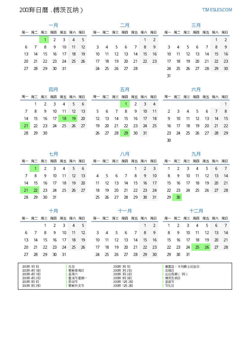 陽曆,不是飛躍年,一年365天。 在2003年,2003有18 假期和休假。 在中國東部的日曆上,2003年羊年。 一年從在星期三開始,到在星期三結束。