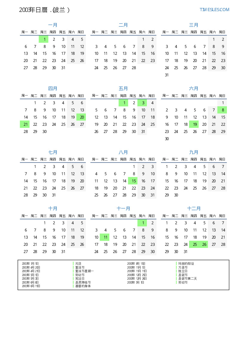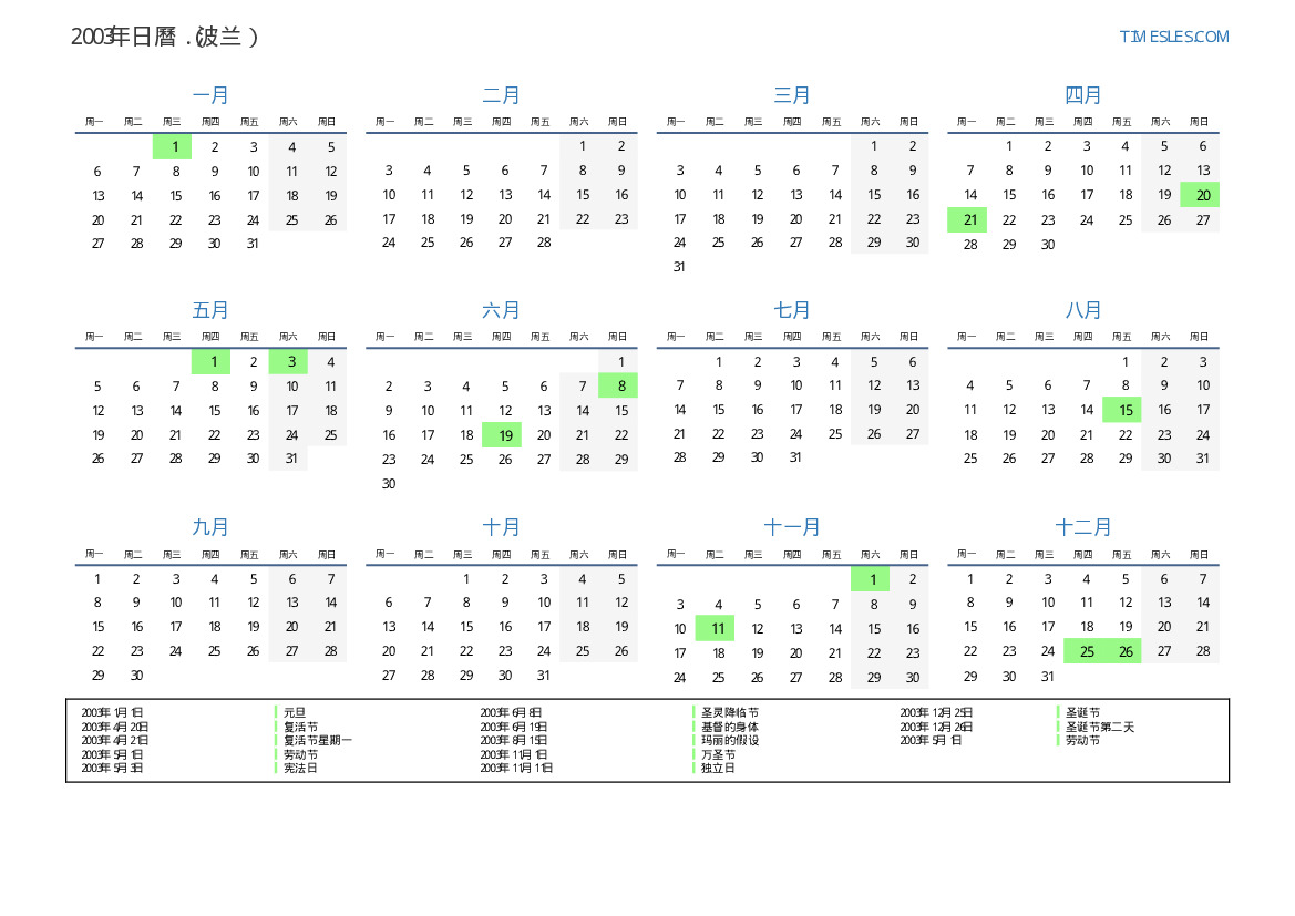 下載並打印2003年波兰節假日和周末的PDF日曆