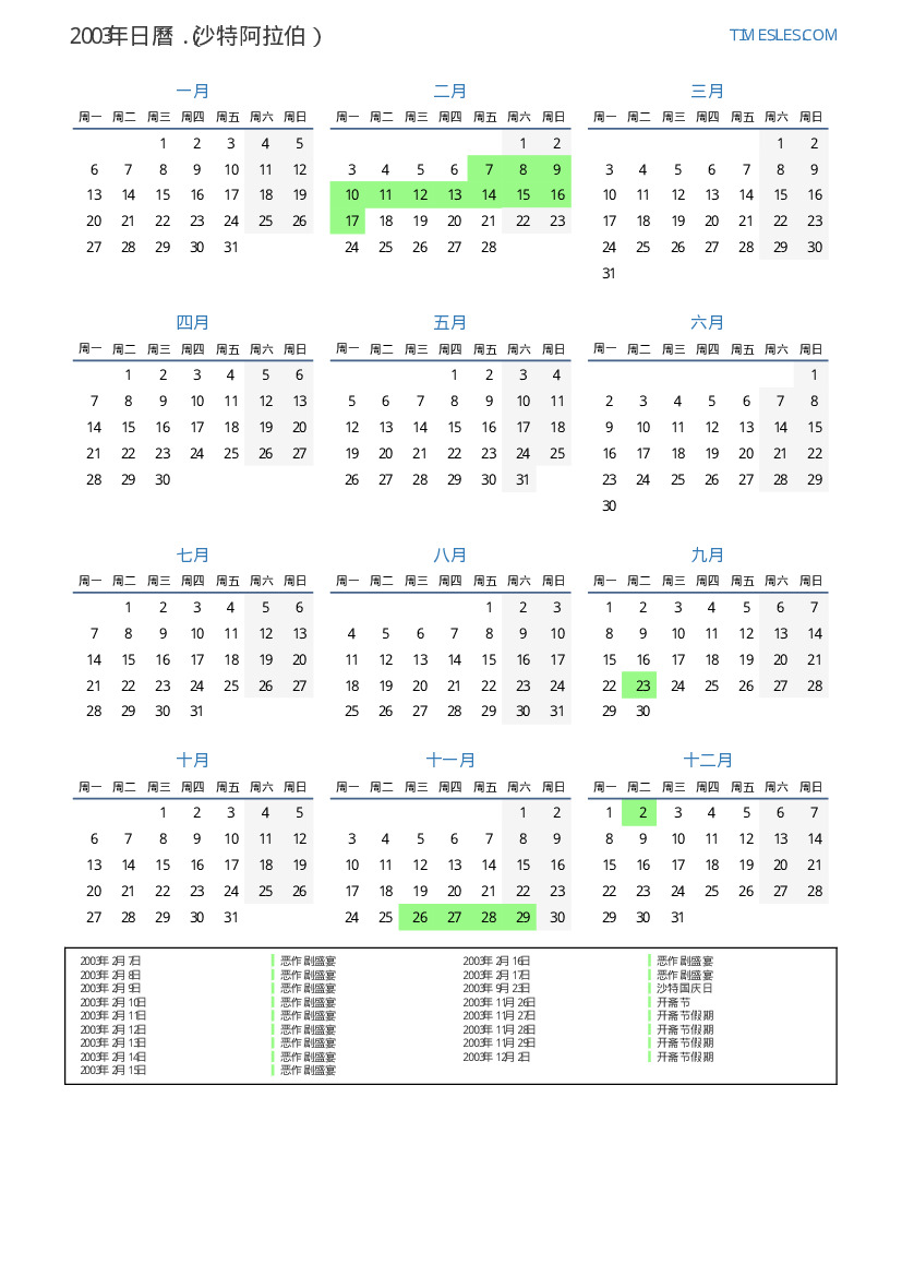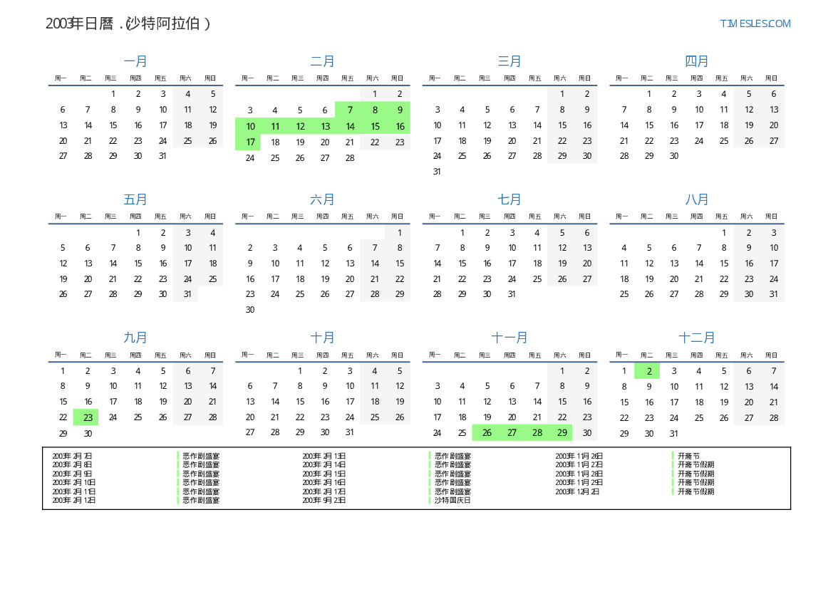 下載並打印2003年沙特阿拉伯節假日和周末的PDF日曆
