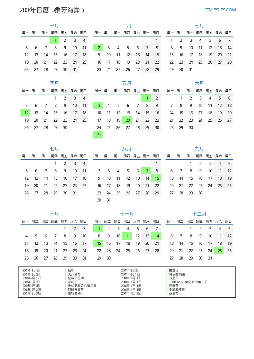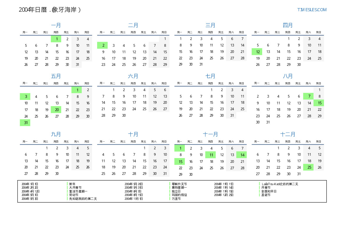 下載並打印2004年科特迪瓦節假日和周末的PDF日曆