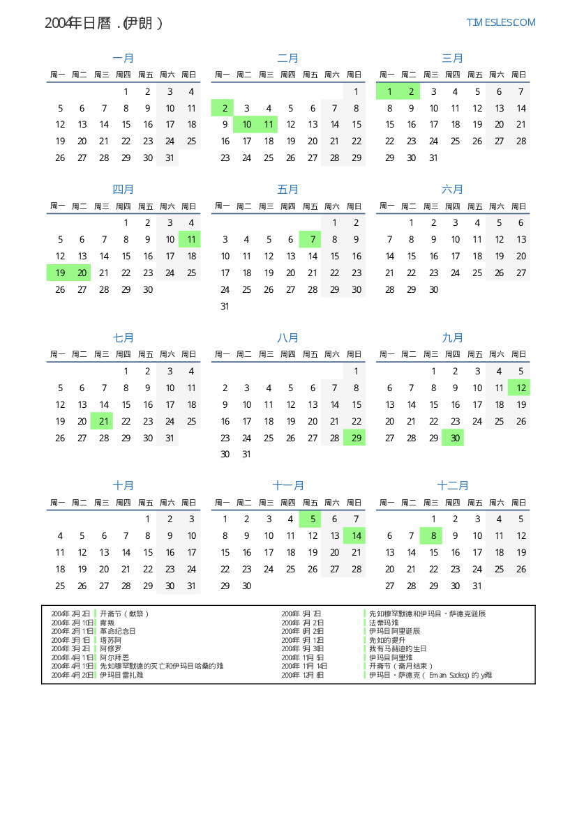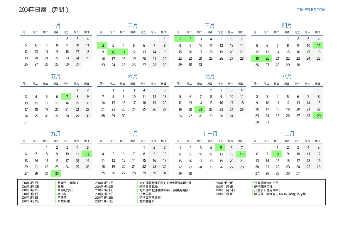 下載並打印2004年伊朗節假日和周末的PDF日曆