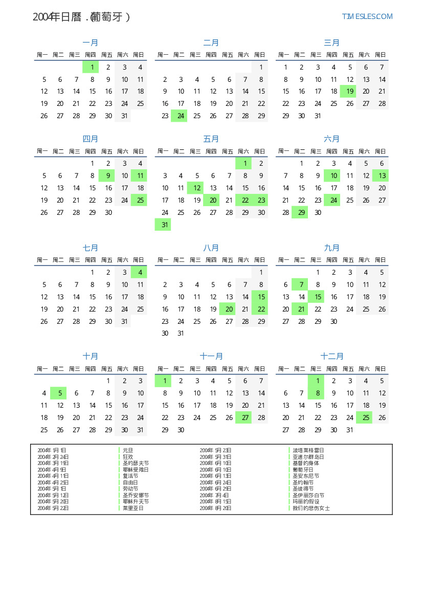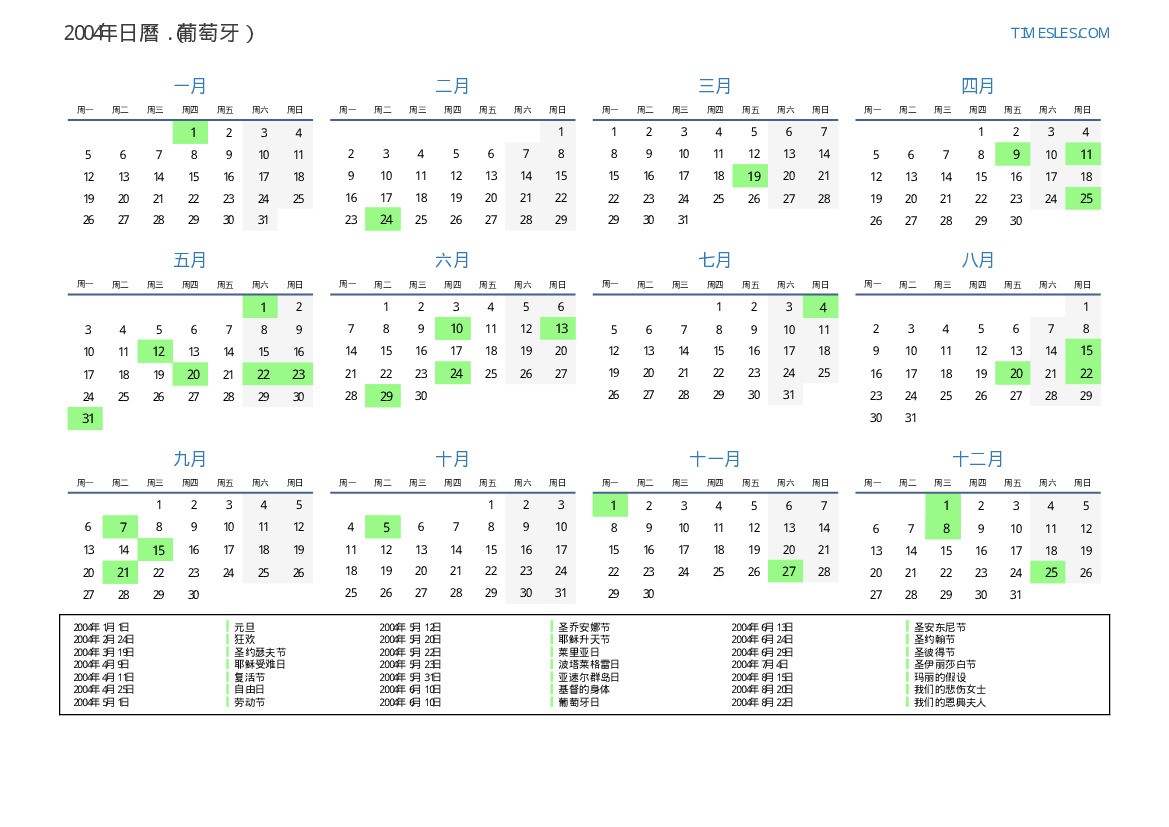 下載並打印2004年葡萄牙節假日和周末的PDF日曆