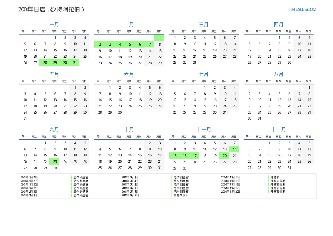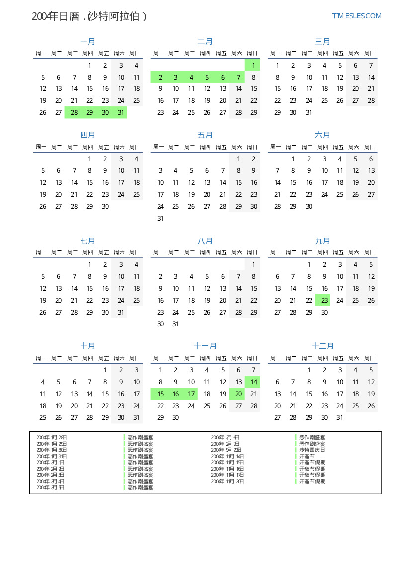 下載並打印2004年沙特阿拉伯節假日和周末的PDF日曆