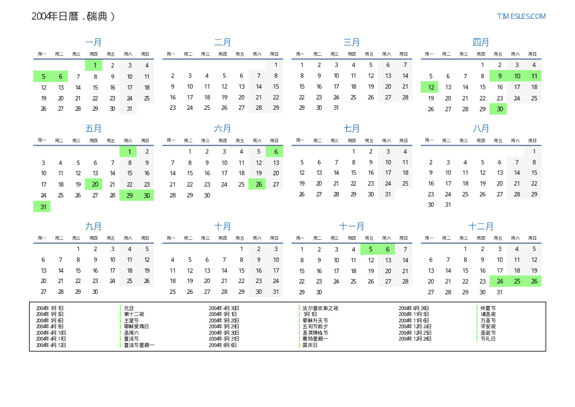 下載並打印2004年瑞典節假日和周末的PDF日曆