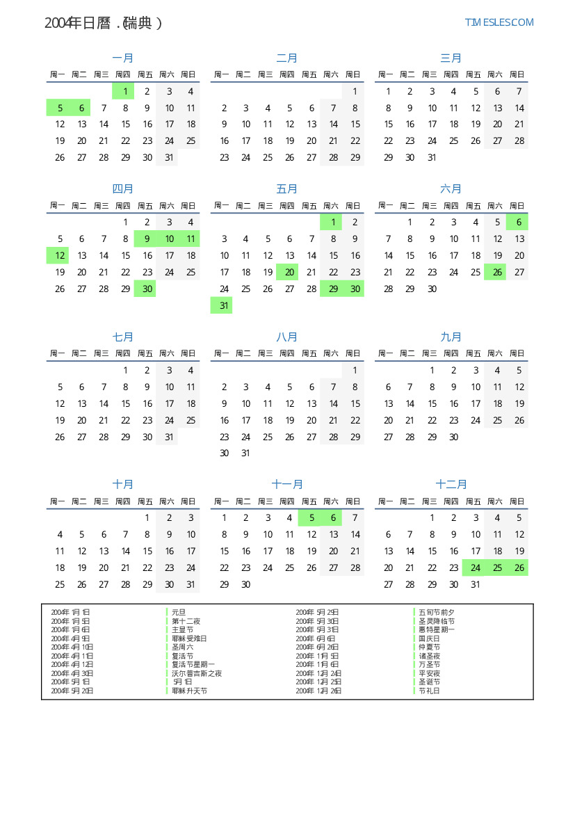 2004年瑞典日曆