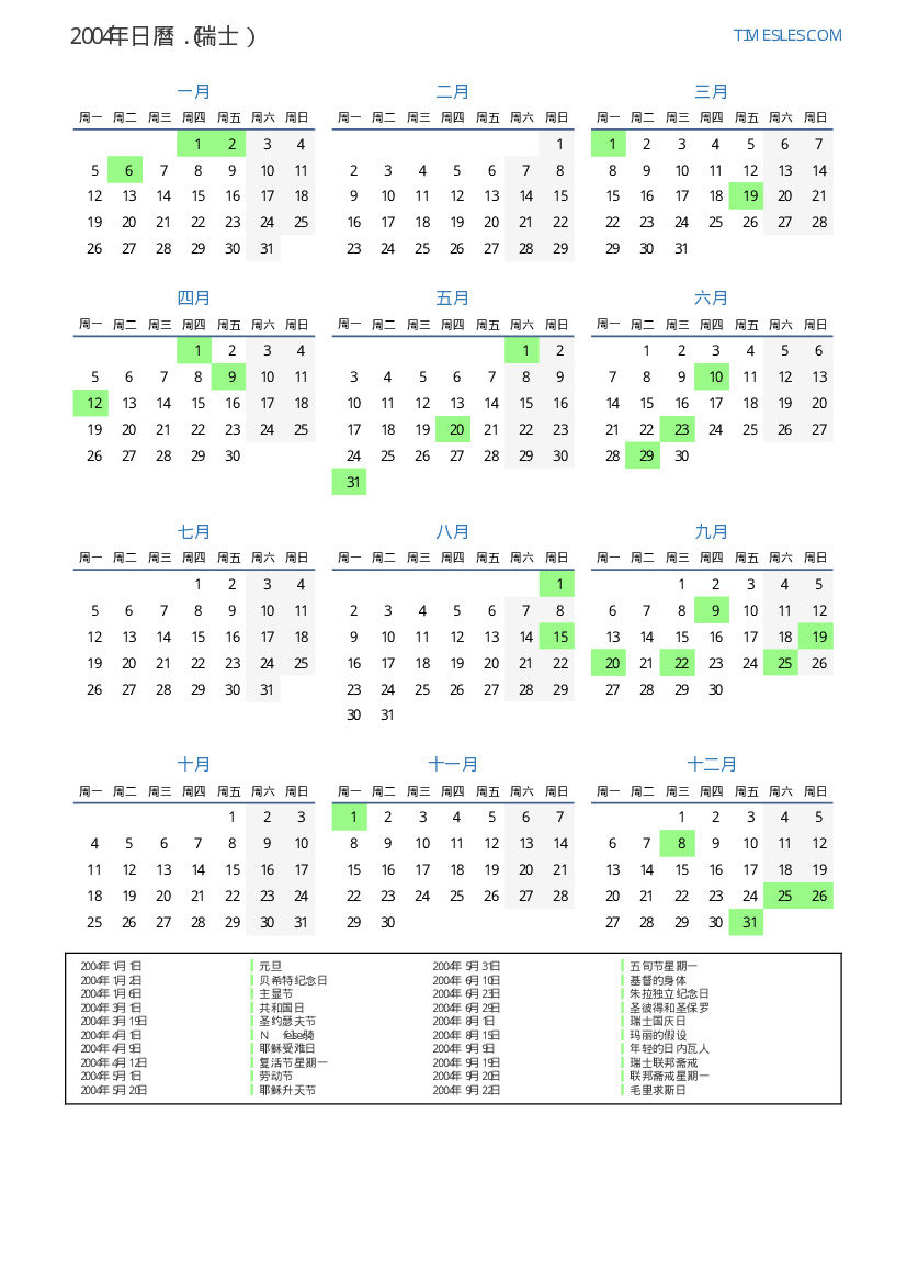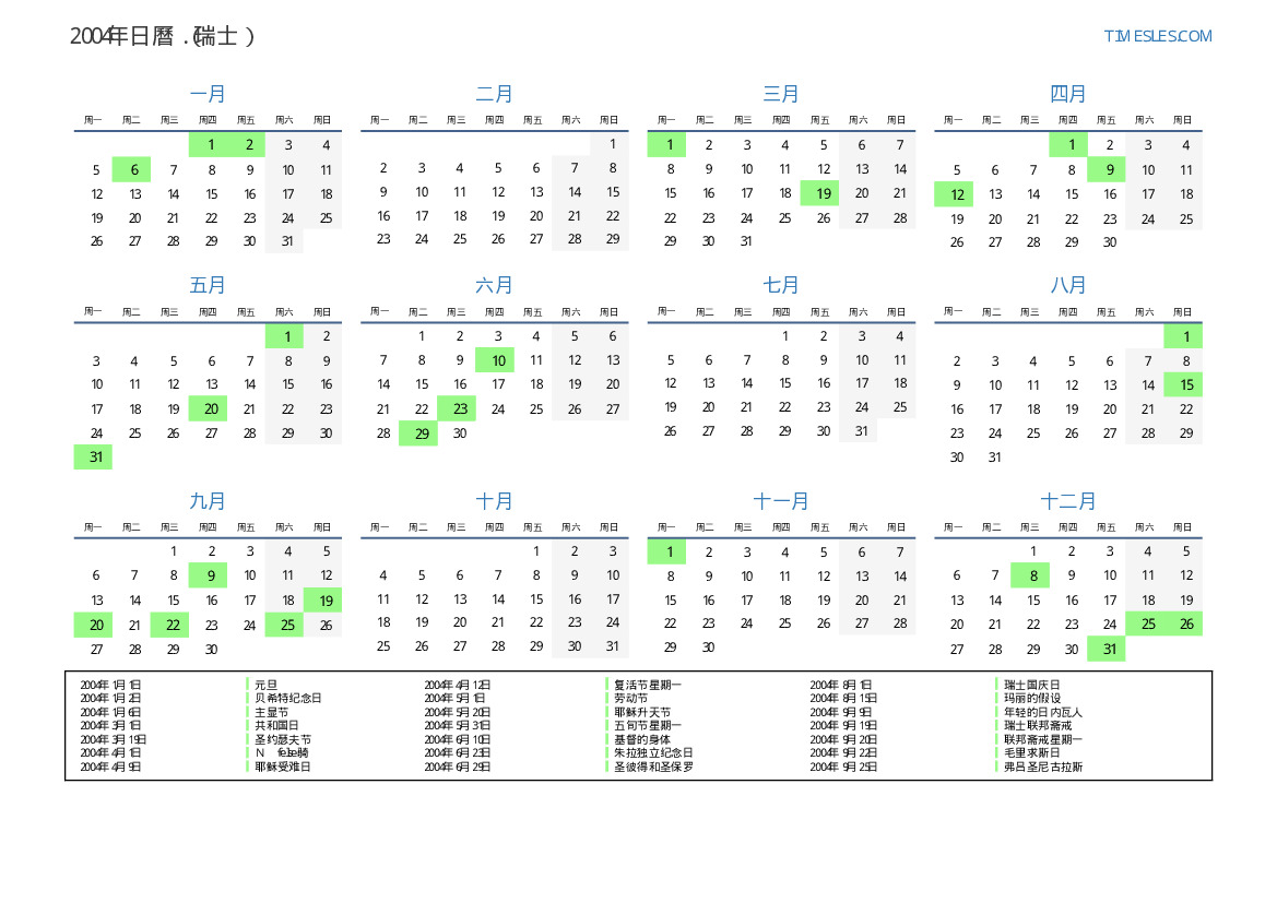 下載並打印2004年瑞士節假日和周末的PDF日曆