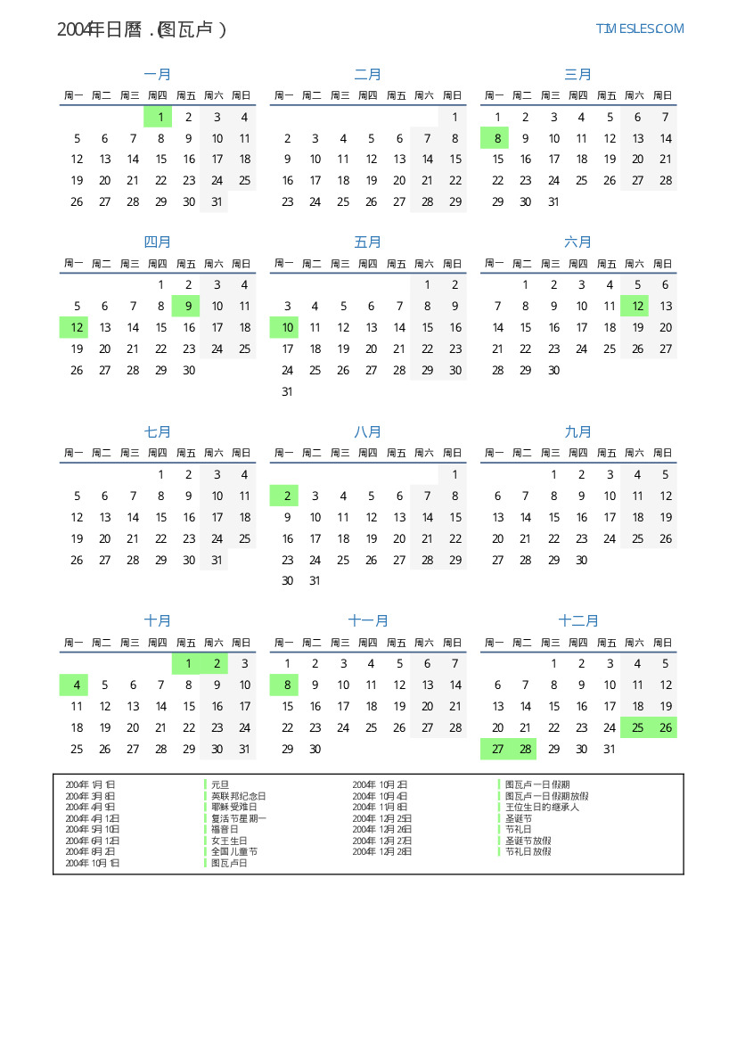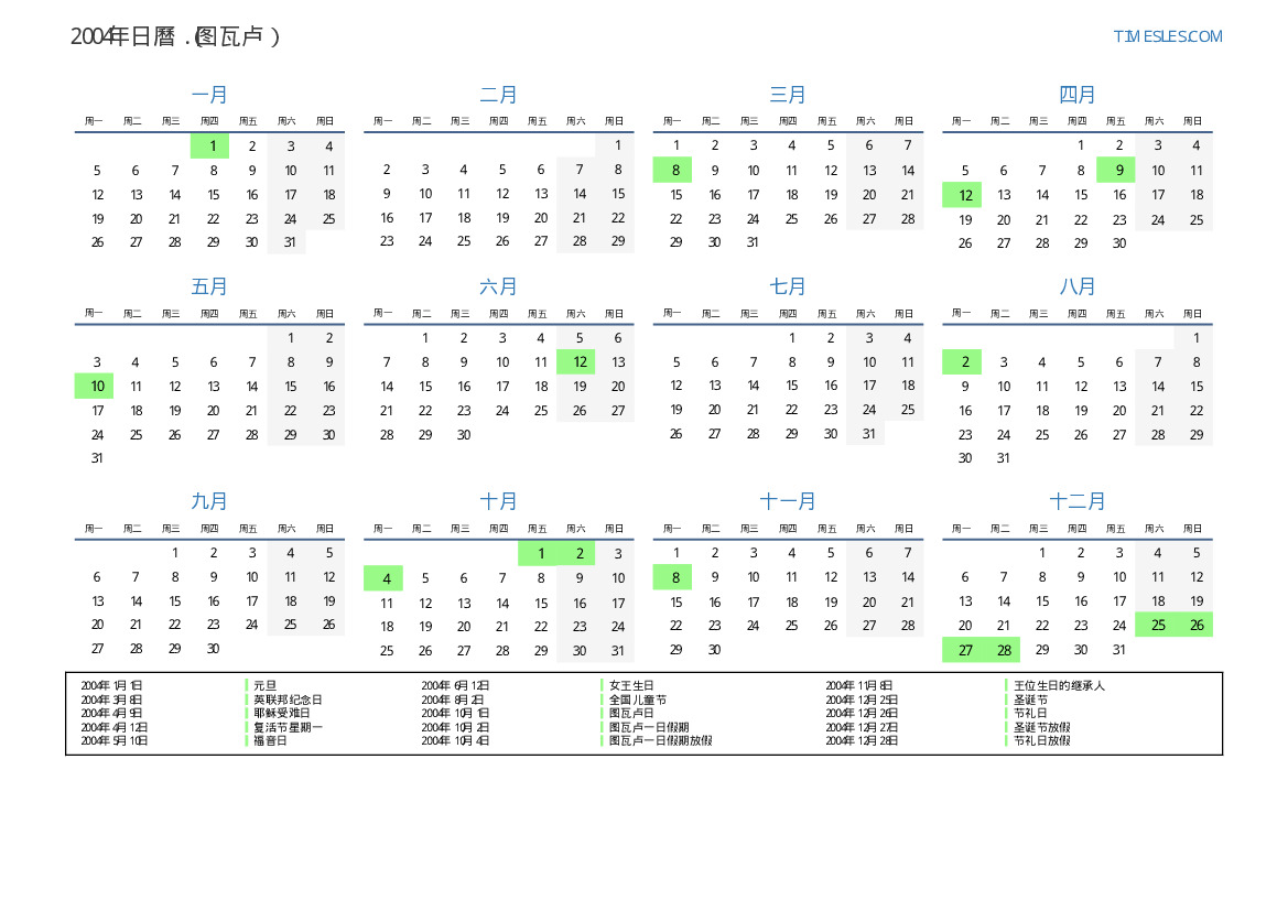 下載並打印2004年对于图瓦卢節假日和周末的PDF日曆