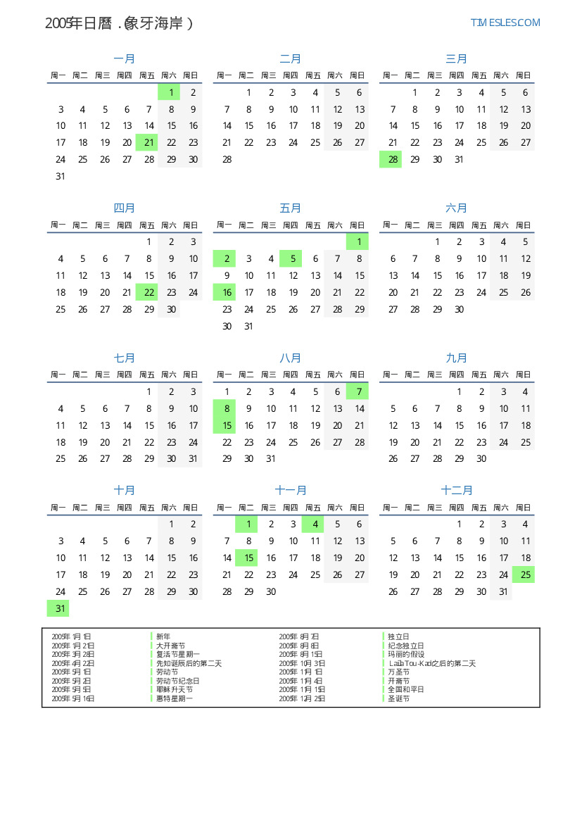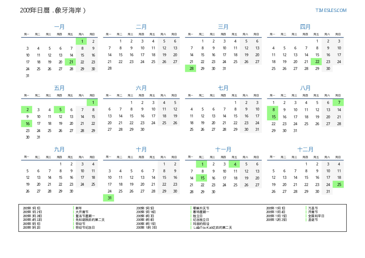 下載並打印2005年科特迪瓦節假日和周末的PDF日曆