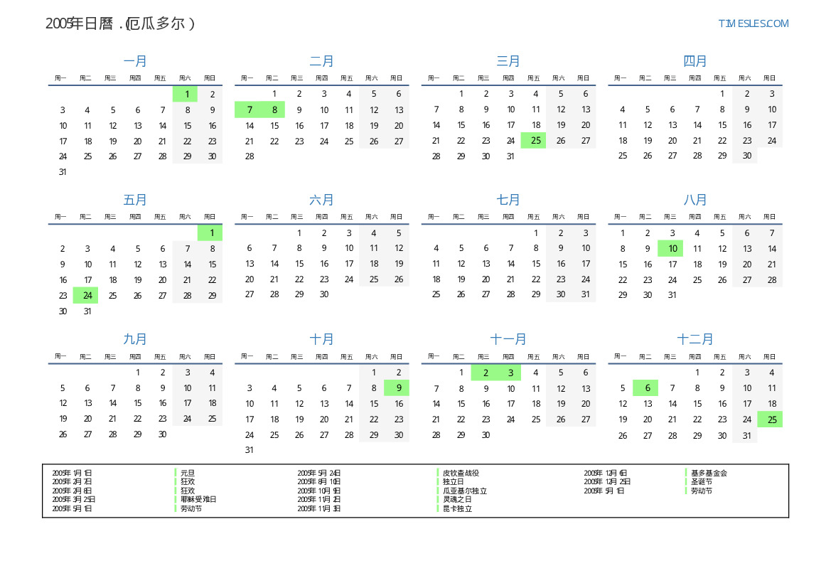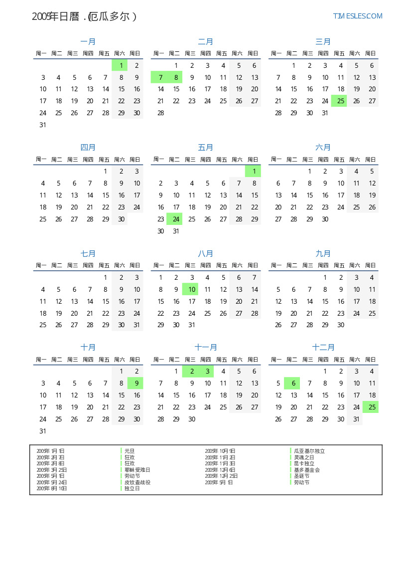 下載並打印2005年厄瓜多尔節假日和周末的PDF日曆