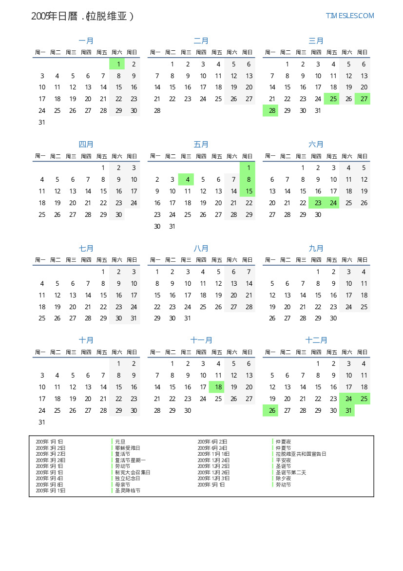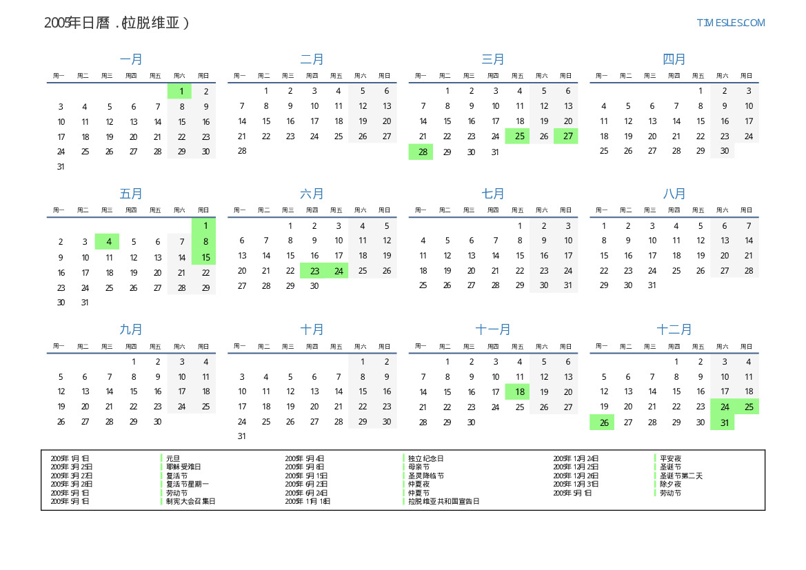 下載並打印2005年拉脱维亚節假日和周末的PDF日曆