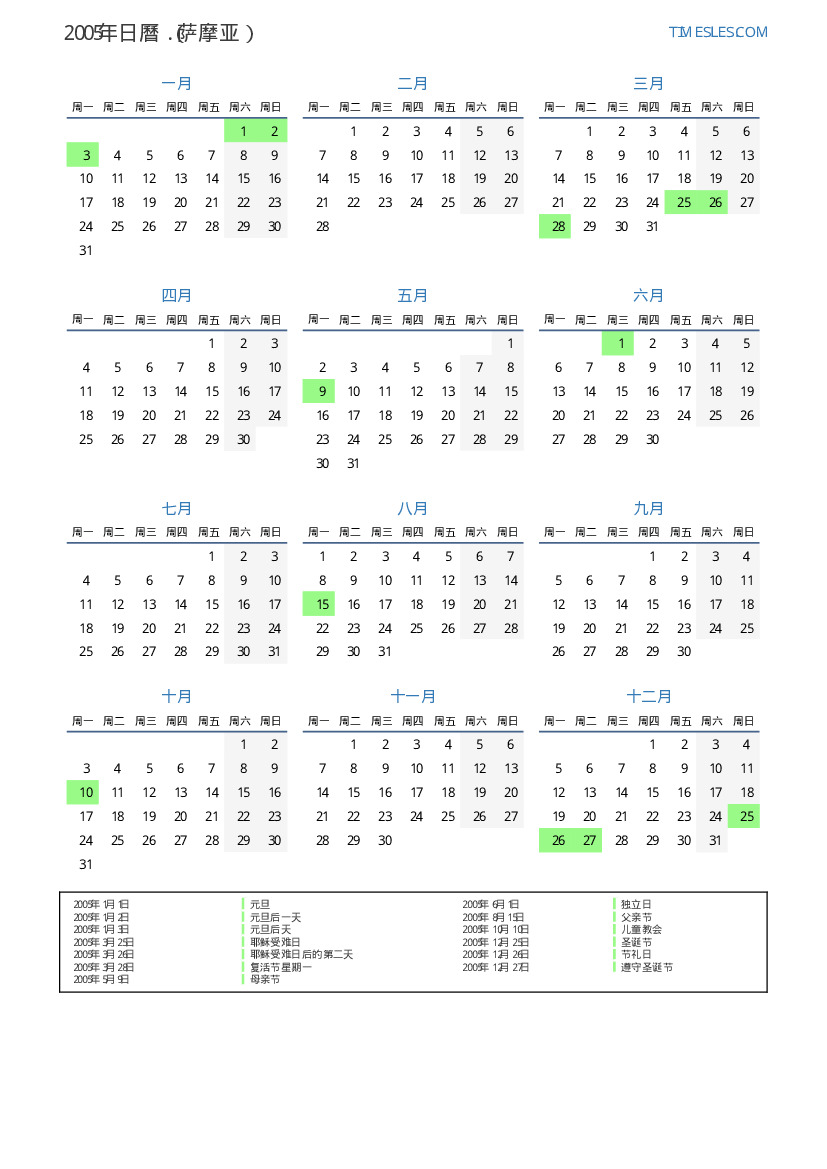 下載並打印2005年萨摩亚節假日和周末的PDF日曆