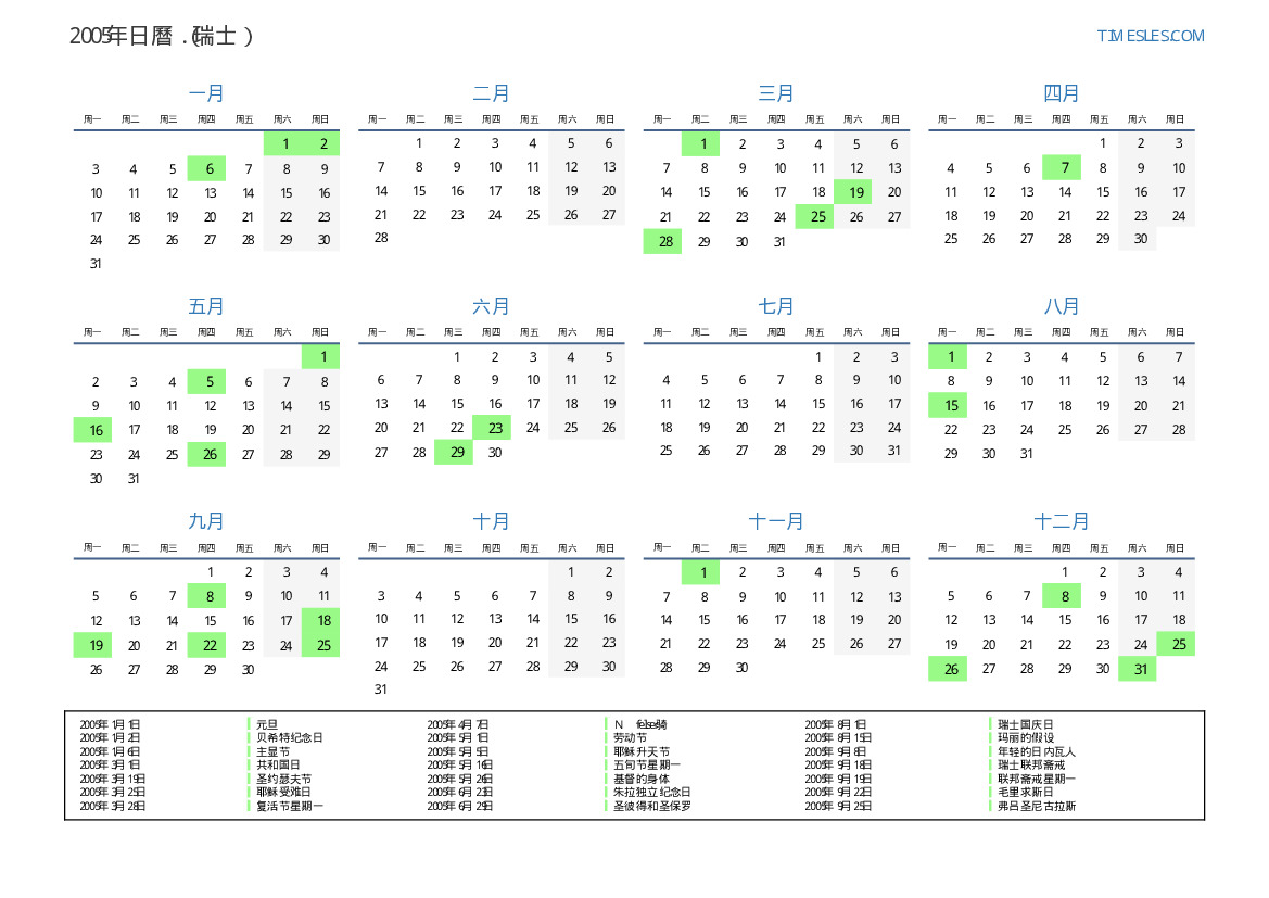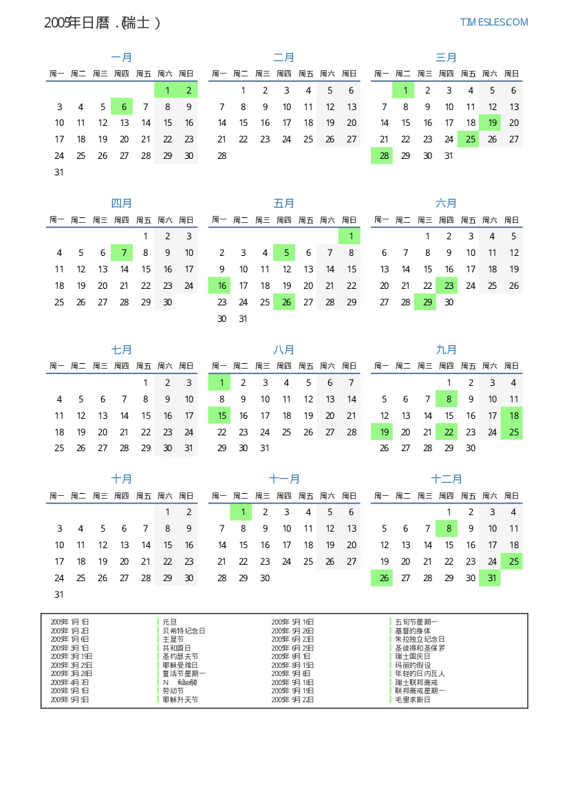 下載並打印2005年瑞士節假日和周末的PDF日曆