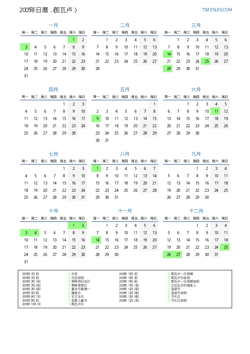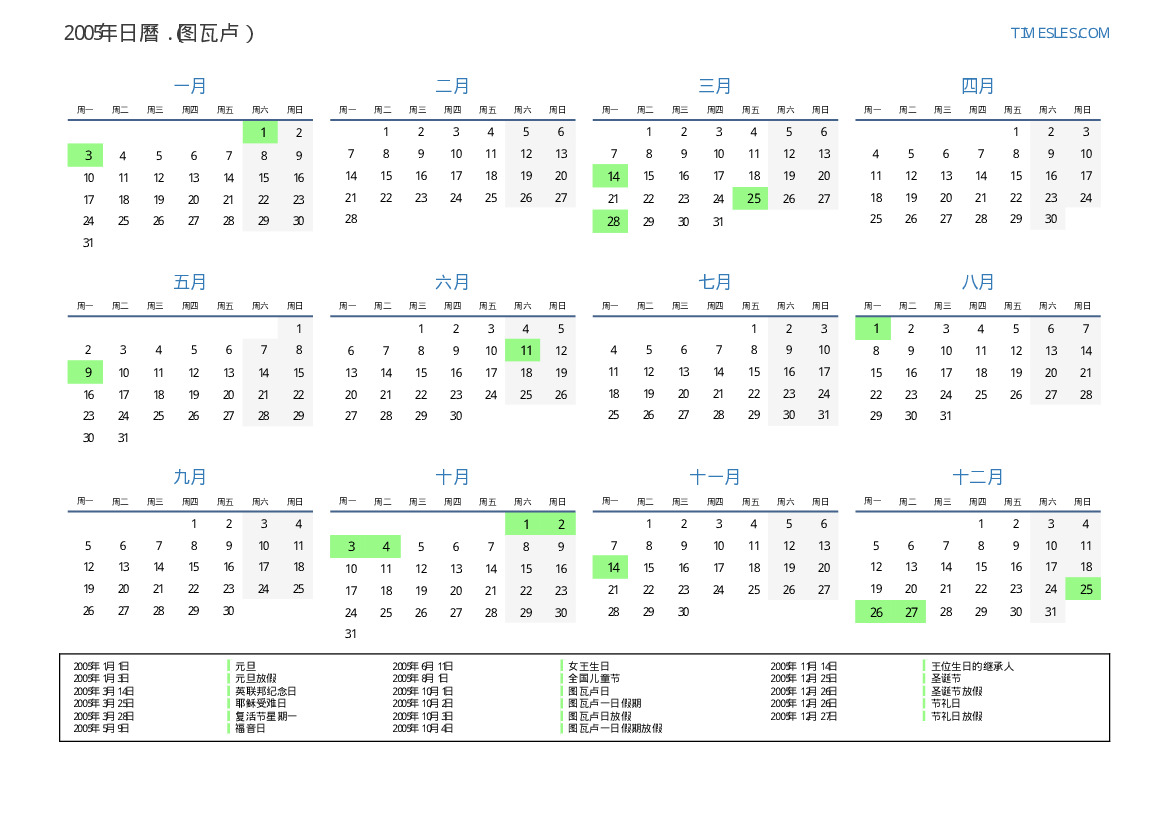 盧薩对于图瓦卢的2005年假期和周末日曆