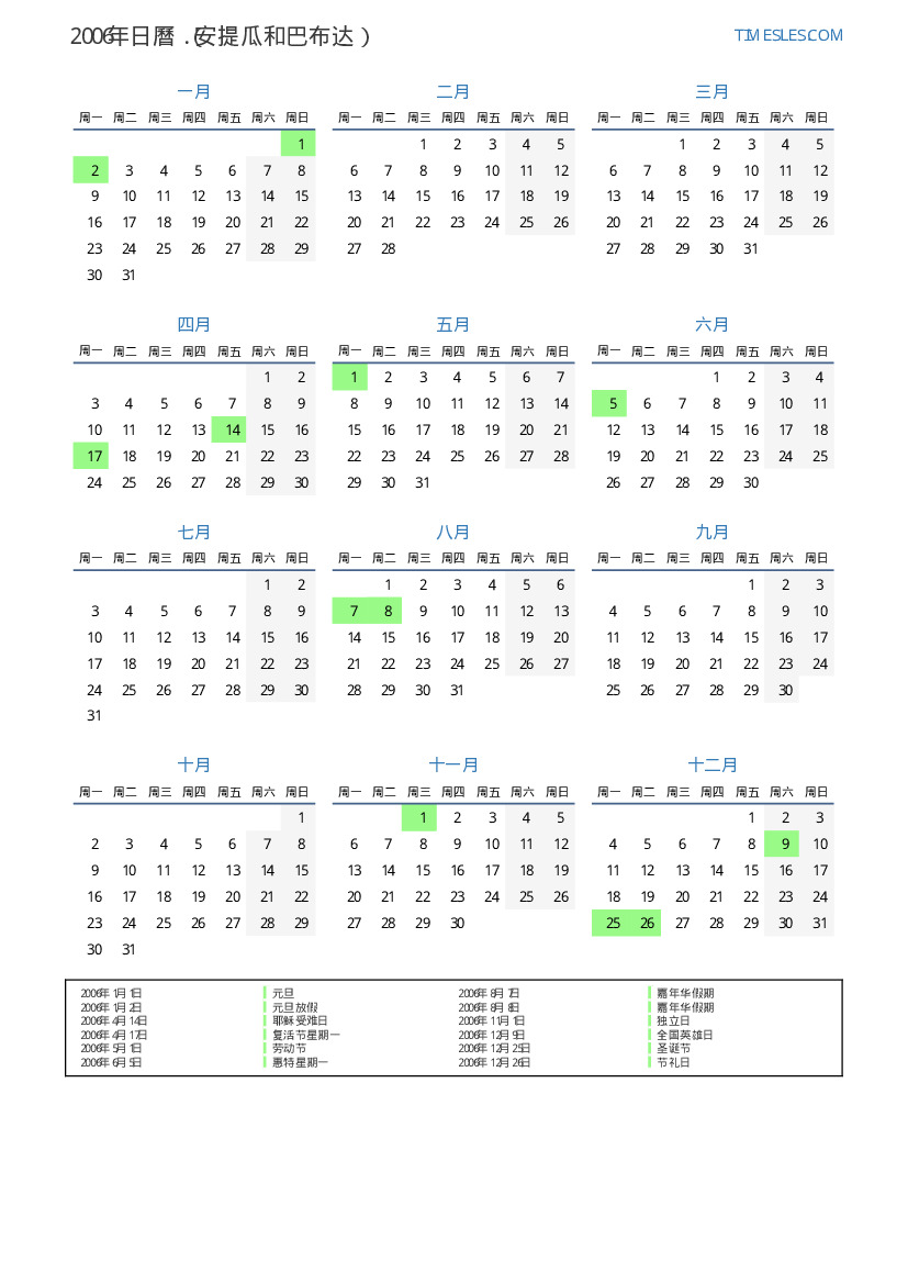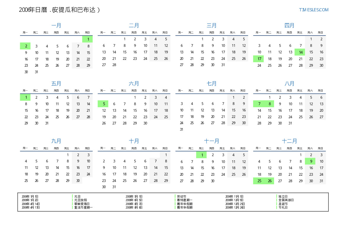 下載並打印2006年安提瓜和巴布达節假日和周末的PDF日曆