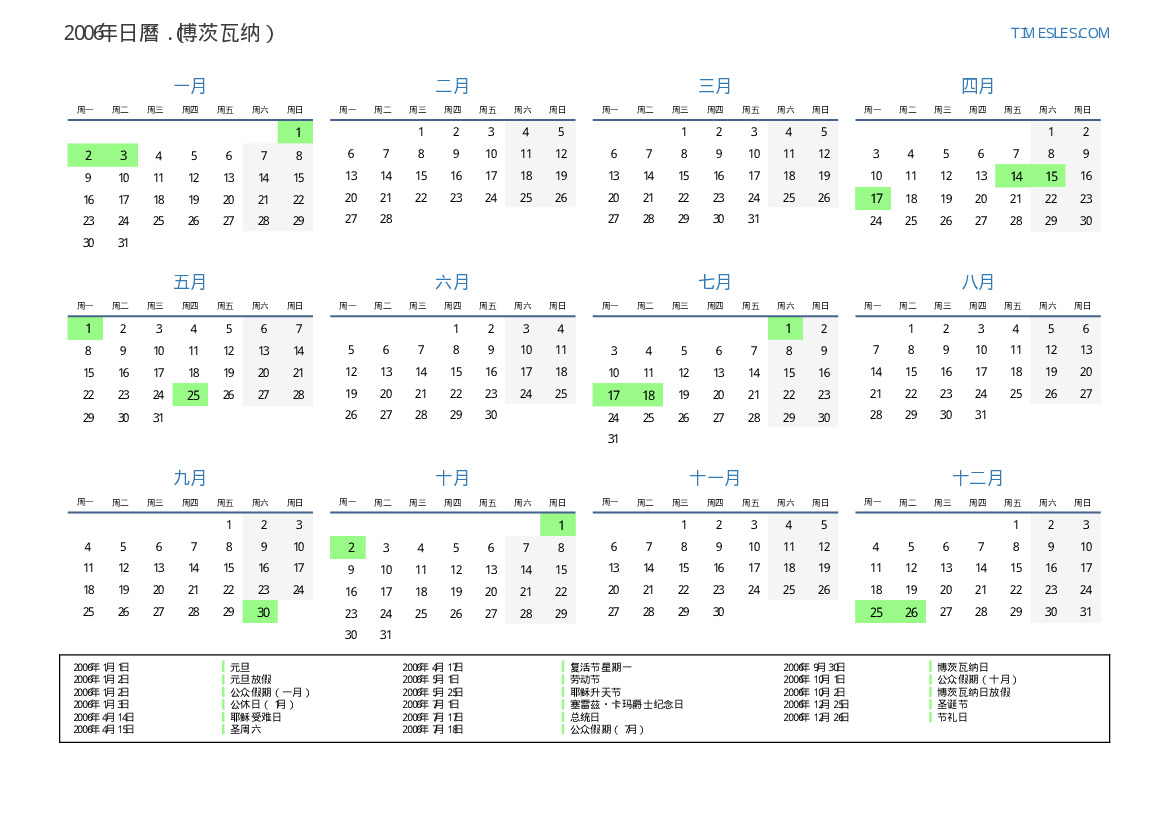 盧薩博茨瓦纳的2006年假期和周末日曆