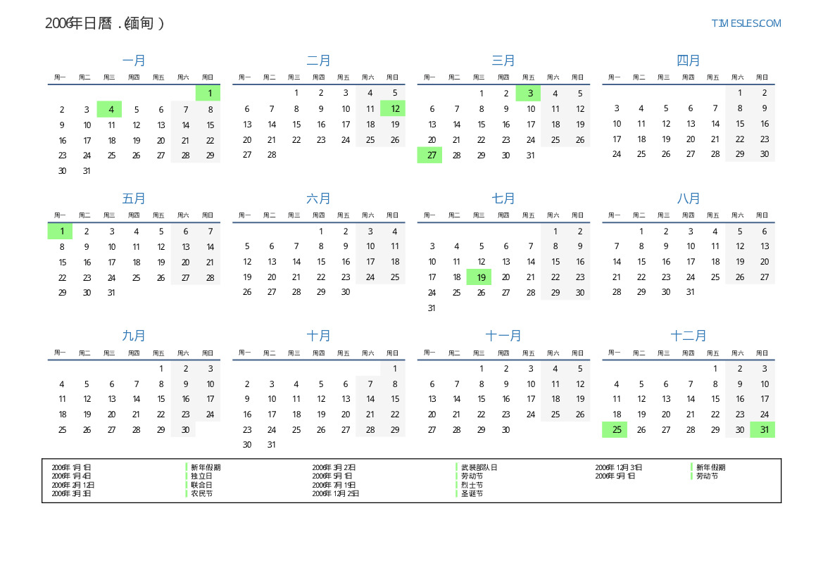 下載並打印2006年缅甸節假日和周末的PDF日曆