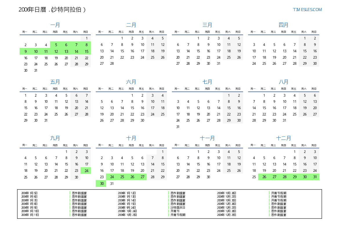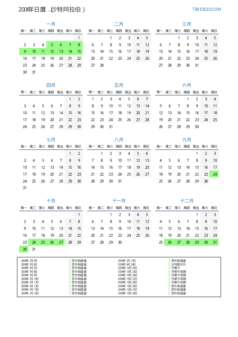下載並打印2006年沙特阿拉伯節假日和周末的PDF日曆