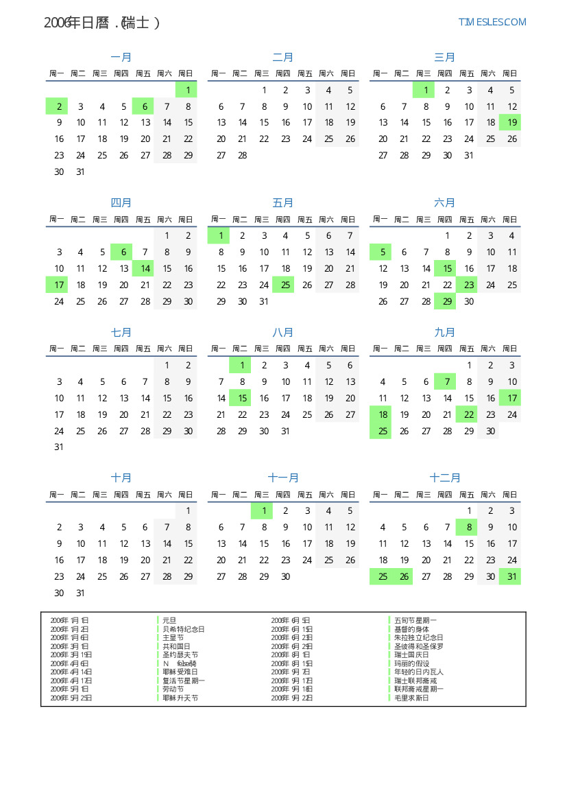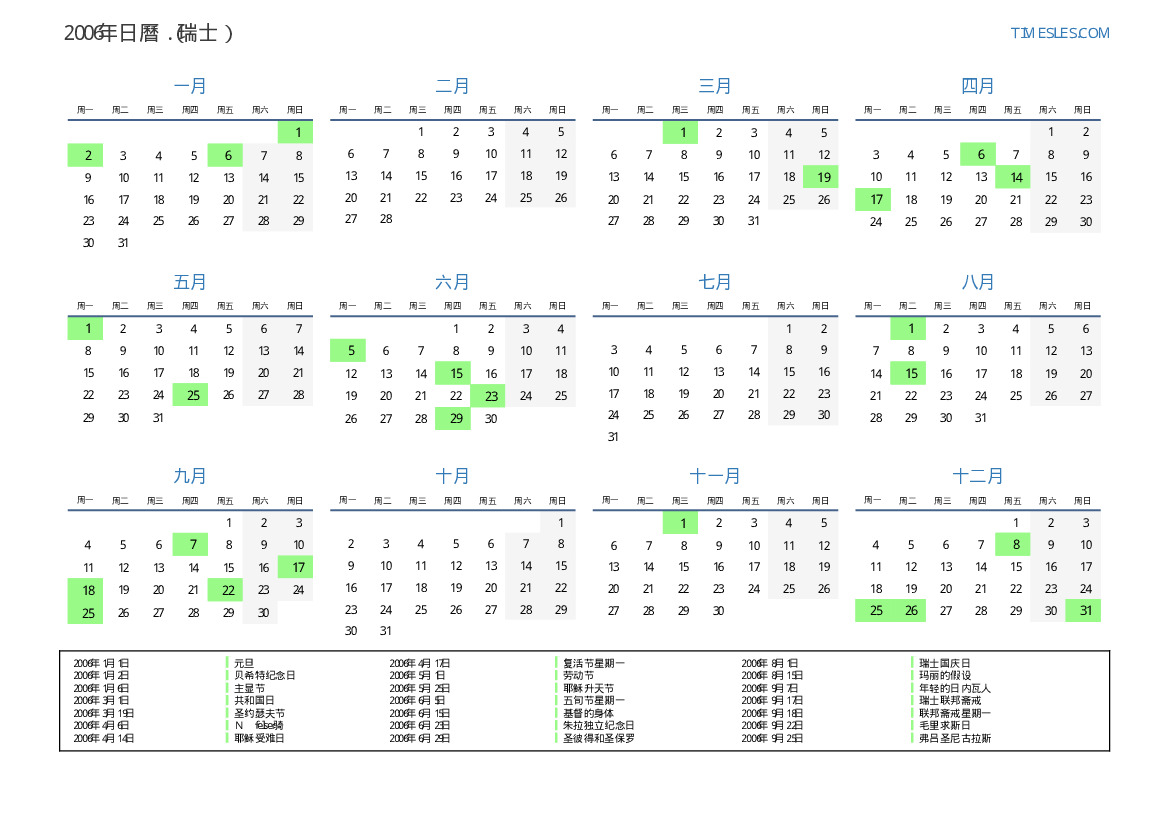 下載並打印2006年瑞士節假日和周末的PDF日曆