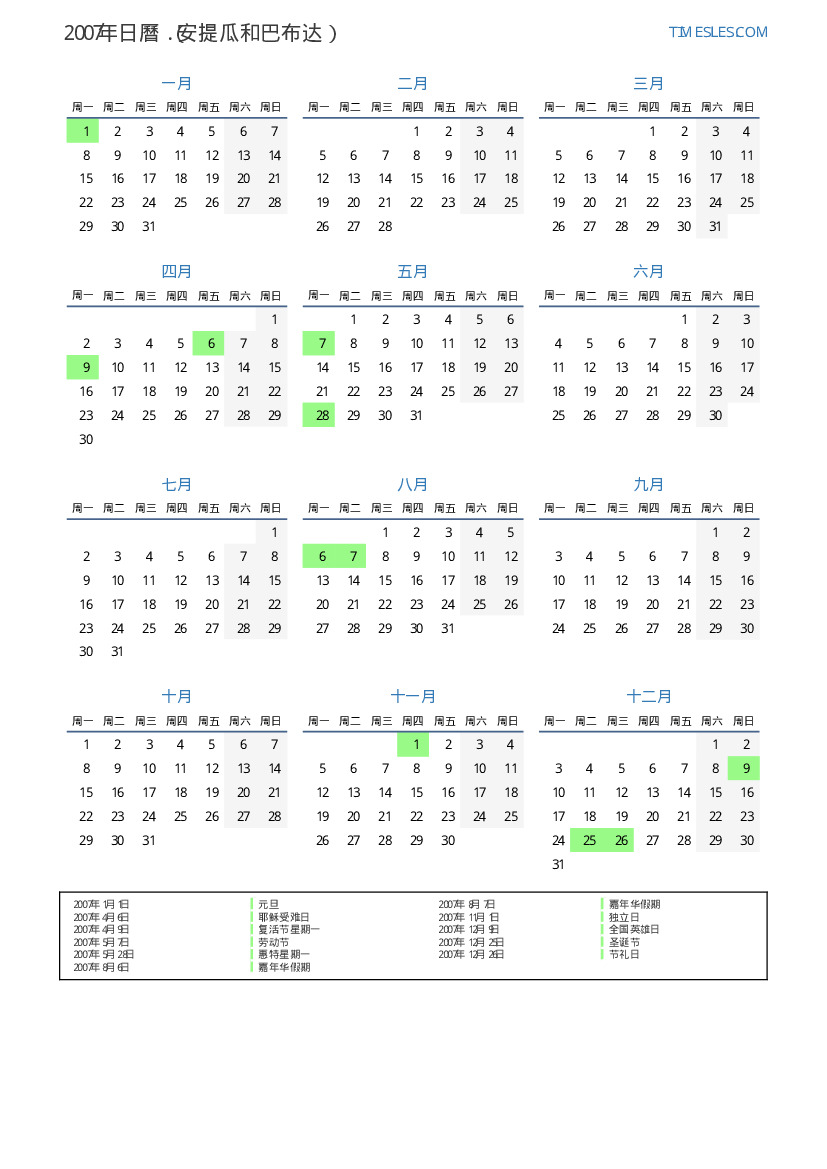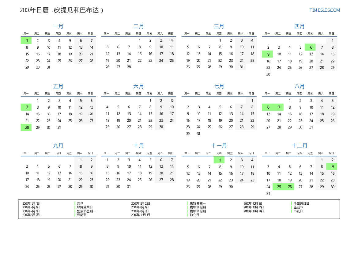 下載並打印2007年安提瓜和巴布达節假日和周末的PDF日曆