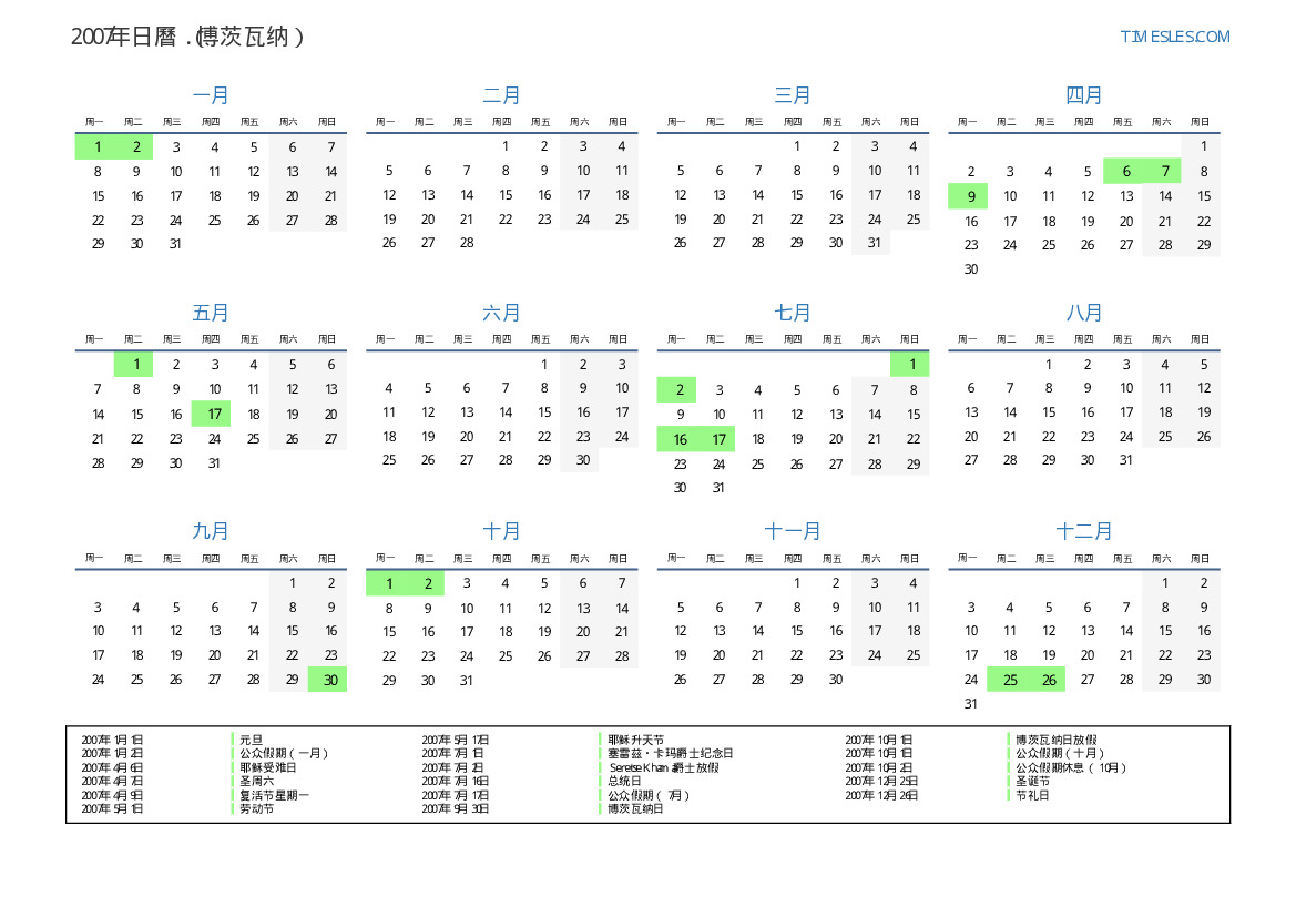 盧薩博茨瓦纳的2007年假期和周末日曆