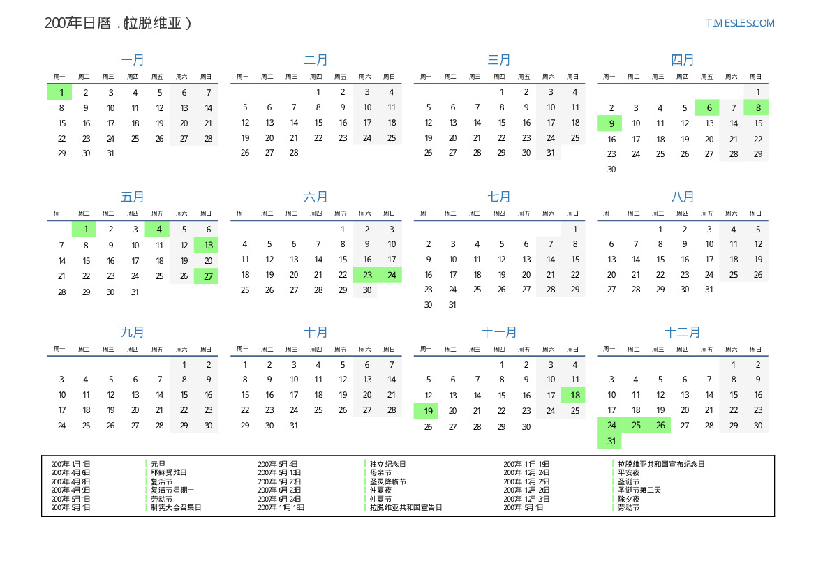 下載並打印2007年拉脱维亚節假日和周末的PDF日曆