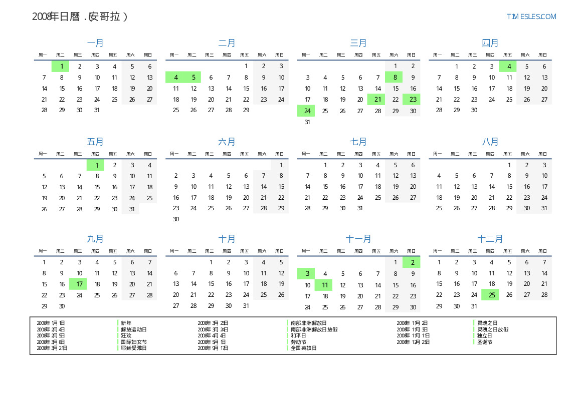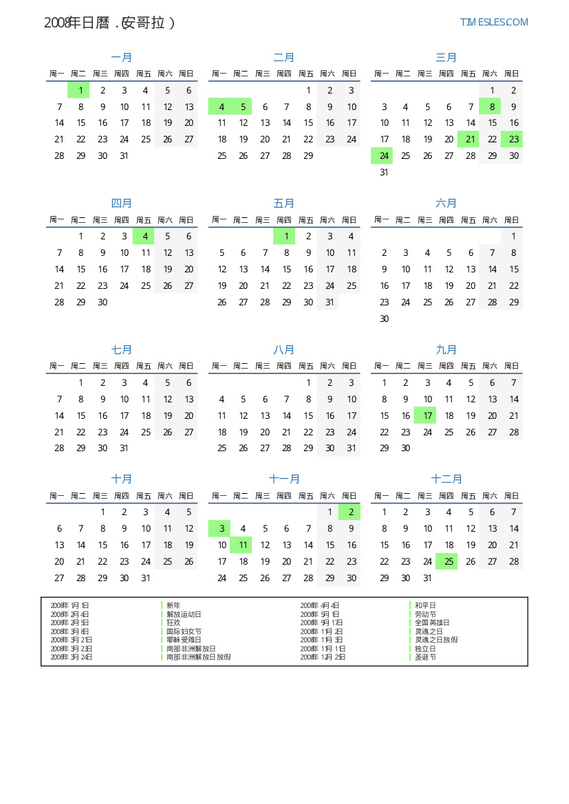 下載並打印2008年为安哥拉節假日和周末的PDF日曆